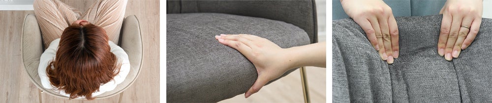 生地には厚みのある丈夫なシェニール織のファブリックを使用しています。色褪せやほつれに強く上質な手触りなので、お気に入りのチェアの見た目がすぐに劣化してしまうこともありません。また、さらりとした手触りで、夏は蒸れにくく冬はひんやりしにくいオールシーズン快適な触り心地となっています。