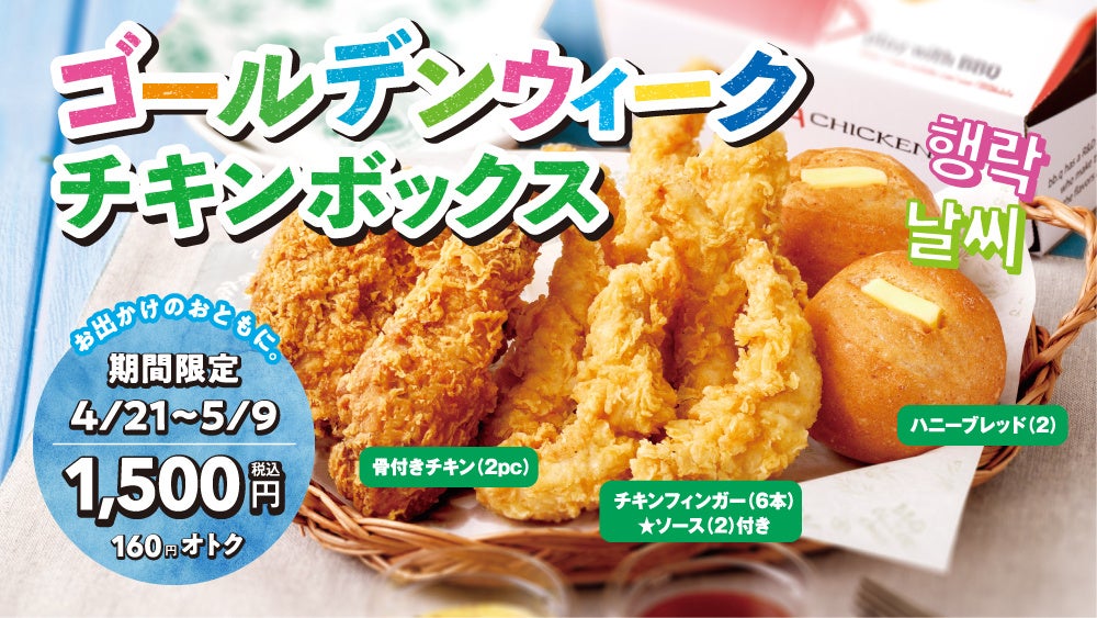 『bb.q オリーブチキンカフェ(以下オリーブチキン)』は4月21日から期間限定でお得なゴールデンウィークチキンボックスの販売を開始いたしします。ゴールデンウィークチキンボックスは、連休中のお出かけのおともにぴったりなチキンボックスです。定番の骨付きオリーブチキン2本、オリーブチキンフィンガー6本に人気のハニーブレッド2つついて1500円で販売をいたします。ゴールデンウィークにカリっと軽やかなオリーブチキンを片手にご家族・ご友人とのピクニック・お出かけにご利用ください。