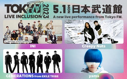 TOKYO FMが2023年5月1日(月)、日本武道館で開催するライブイベント『TOKYO FM LIVE INCLUSION 2023』(出演:INI、Creepy Nuts、GENERATIONS、yama)のオンライン生配信が決定しました。