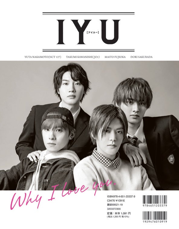 「IYU(アイユー)=私が君を好きな理由」をテーマに送るグラビアムック本です。俳優やK-POPアーティストの撮りおろしインタビューが満載。表紙には、グラビア誌ではソロ初表紙となる川西拓実(JO1)。裏表紙にはドラマ『クールドジ男子』主演の中本悠太(NCT 127)&川西拓実(JO1)&藤岡真威人&桜田通。
