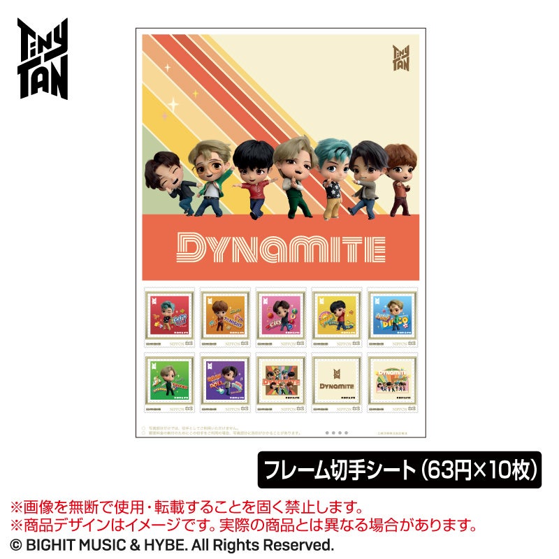 RM、Jin、SUGA、j-hope、Jimin、V、Jung Kookが、大ヒット曲「Dynamite」の世界観を表現したデザインの限定メモリアルフレーム切手は必見となります。