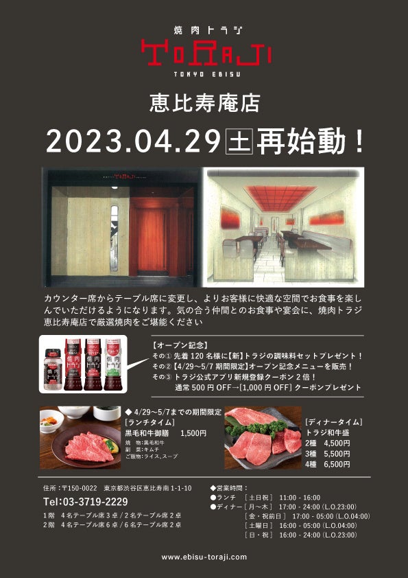 株式会社トラジは、焼肉トラジの1999年に開店した2号店舗目である恵比寿庵店をリニューアルいたします。