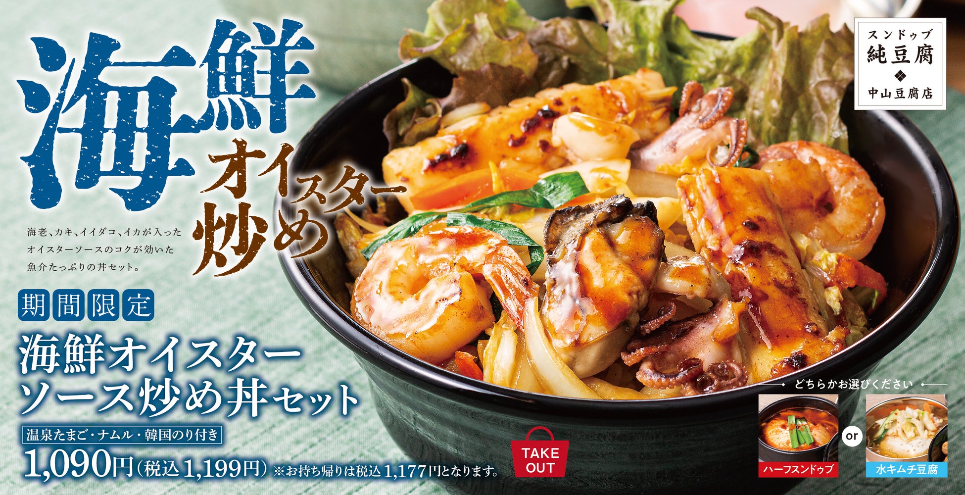 海老、カキ、イイダコ、イカをコクのあるオイスターソースで炒め、食べ応えのある魚介の旨みたっぷりの丼に仕上げました。昼夜の寒暖差が大きい初夏の気候でも、手作りしている自家製の豆腐を美味しく召し上がっていただけるよう、熱々の「ハーフスンドゥブ」もしくはさっぱりとした「水キムチ豆腐」をお選びいただけるセットメニューです。