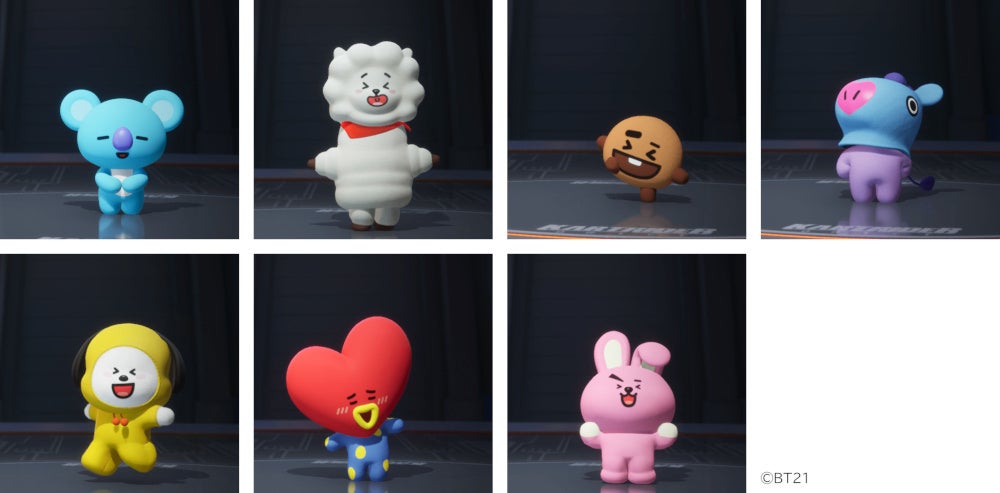 このたびのアップデートで、『BT21』のKOYA、 RJ、 SHOOKY、 MANG、 CHIMMY、 TATA、 COOKYのキャラクターがゲーム内のアイテムショップに登場するほか、エモートや絵文字、カートボディに貼り付けられるステッカーなど、各キャラクターのアイテムもショップにてご購入いただけます。