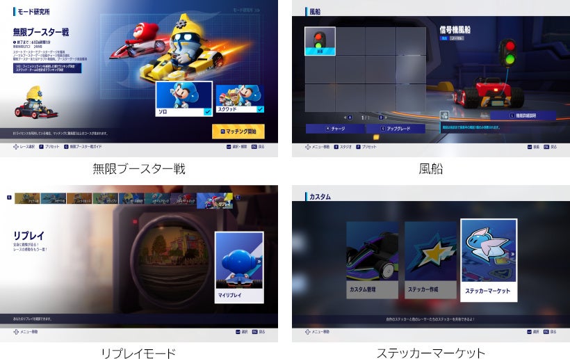 ソロプレイでもオンラインでのマルチプレイでも、アイテムを駆使したダイナミックな「アイテム戦」や爽快感MAXの「スピード戦」など、様々なゲームモードでお楽しみいただけます。