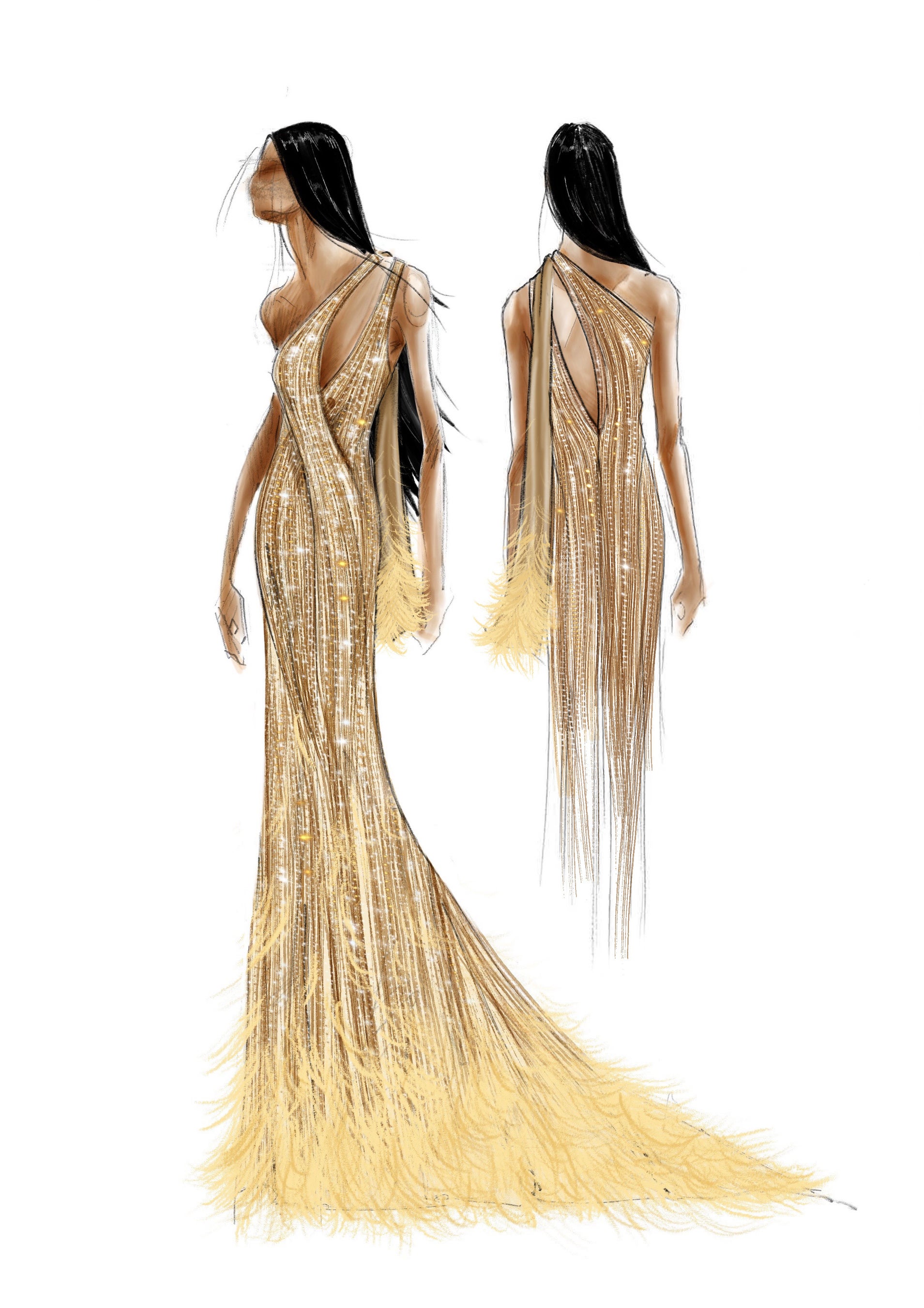 フェザーがあしらわれたヌードカラーのチュールをベースに、ビーズを手刺繍した非の打ちどころのないゴールドトーンのフロアレングスのドレスでパーティーに登場し、招待客を沸かせました。脚の上部から裾に向かってフェザーの密度が増していくグラデーションが施されたトレーンがアクセントになったこのドレスは、息をのむような深いV字のネックラインと、左肩を飾る2本の交差したストラップが特徴です。