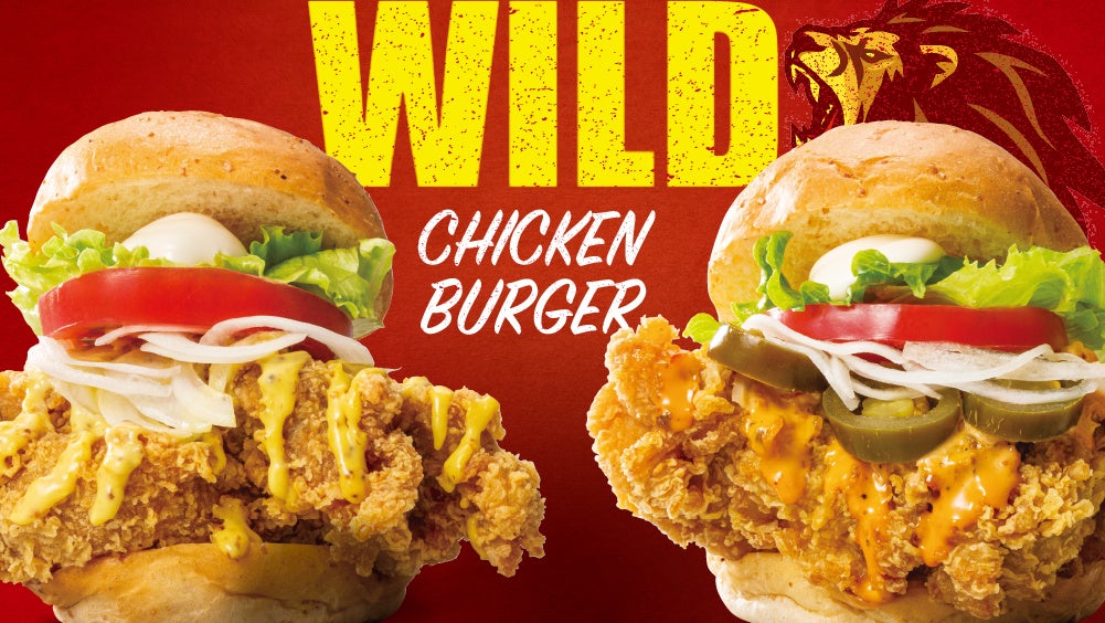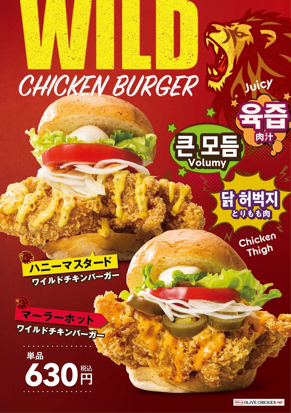 『ワイルドチキンバーガー』は食べ応えのある鶏モモ肉を、『オリーブチキンカフェ』の独自製法をそのままに仕上げた重量級オリジナルフライドチキンに仕立て、フレッシュ野菜とともに全粒粉バンズに挟み込みました。ソースはガッツリチキンの味に負けない『ハニーマスタード』と『マーラーホットマヨ』の2種類をご用意。従来の『オリーブチキンカフェ』とは一味違った、新体験の味をお届けします。