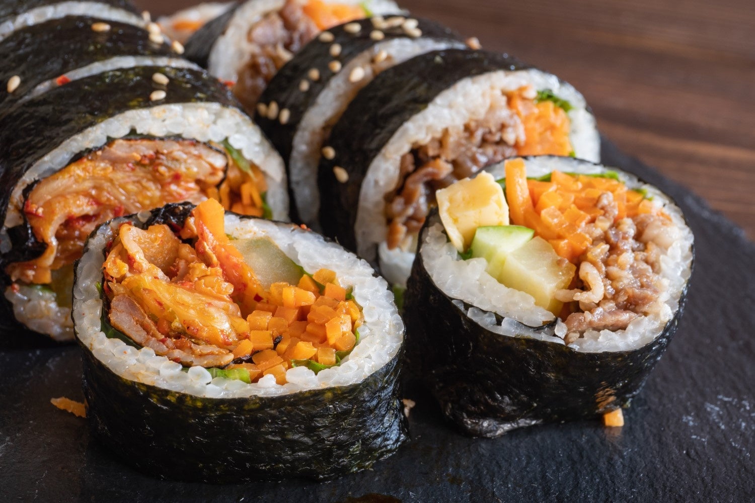 濃厚な味わいのラムの肉味噌やクリームチーズを贅沢に使った、日本でも人気の韓国海苔巻き「キンパ」。