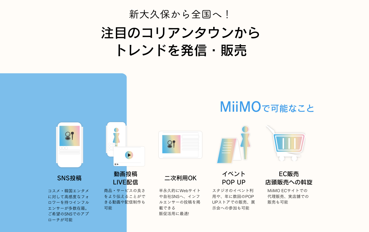 - 韓国コスメ、ブランドに特化した日本のコリアンタウン新大久保の常設スタジオから発信・販売につなげるインフルエンサーマーケティングサービスです。