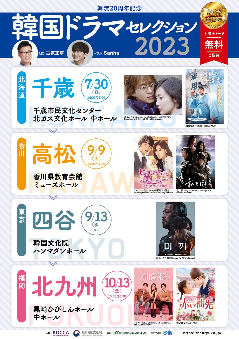 | 【公演詳細】 【開催日時/会場】 7/30(日) 北海道千歳市:千歳市民文化センター北ガス文化ホール 中ホール 1部:受付・開場 13:30 開演 14:00 「冬のソナタ」 2部:受付・開場 16:30 開演 17:00 「朝鮮弁護士」 (原題) 9/9(土) 香川県高松市:香川県教育会館ミューズホール 1部:受付・開場 13:30 開演 14:00 「ヒョンジェは美しい~ボクが結婚する理由」 2部:受付・開場 16:30 開演 17:00 「私の国」 9/13(水) 東京コリアセンター:ハンマダンホール 1部:受付・開場 18:00 開演 18:30 「餌<ミッキ>」 10/13(金) 福岡県北九州市:黒崎ひびしんホール 中ホール 1部:受付・開場 14:30 開演 15:00 「ミラクル」 2部:受付・開場 18:00 開演 18:30 「赤い袖先」 【出演】 MC 古家正亨(ふるや・まさゆき)、Sanha 【主催】 韓国コンテンツ振興院(KOCCA)/ 駐日韓国大使館 韓国文化院 【協力】 aT韓国農水産食品流通公社 【制作/運営】 ぴあ株式会社 【観覧お申込み要領】 ◎観覧無料(事前申込制) ◎申込み: 東京:韓国文化院ホームページ会員登録(無料)必要。 https://www.koreanculture.jp (準備中) 地方:こちらから申請 https://www.pia.co.jp/ssl/cgi-bin/genform/form.cgi?ptn=kpia20thanniv ◎申込期間: 北海道、千歳 :7/7~7/24(月)12:00 香川、 高松 : 7/7~8/31(木)12:00 福岡、 北九州 : 7/7~10/2(月)12:00 ※ 東京で開催されるイベントのご案内、及び参加のお申込みなどについては、後日別途ご案内いたします。 ※お申し込みが定員を超えた場合は、抽選により当選された方にのみ確認書をメールでお送りします。 |