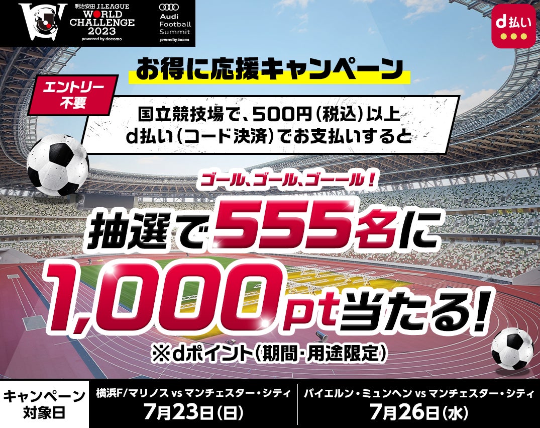 「明治安田Jリーグワールドチャレンジ2023 powered by docomo」および「Audi Football Summit」の開催中、国立競技場の対象店舗(※1)で、1回あたりのお買い物で500円(税込)以上を「d払い(コード決済)」でお支払いされたお客さまの中から抽選で555名様にdポイント1,000ポイント(期間・用途限定)