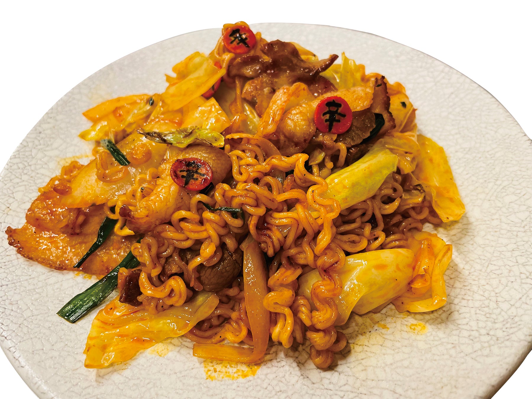「辛ラーメン 焼きそば」と「チャパゲティ」をミックス!韓国のバラエティ番組で人気となったアレンジメニュー。通常の焼きそばとは一味違う、新感覚の味わいです。