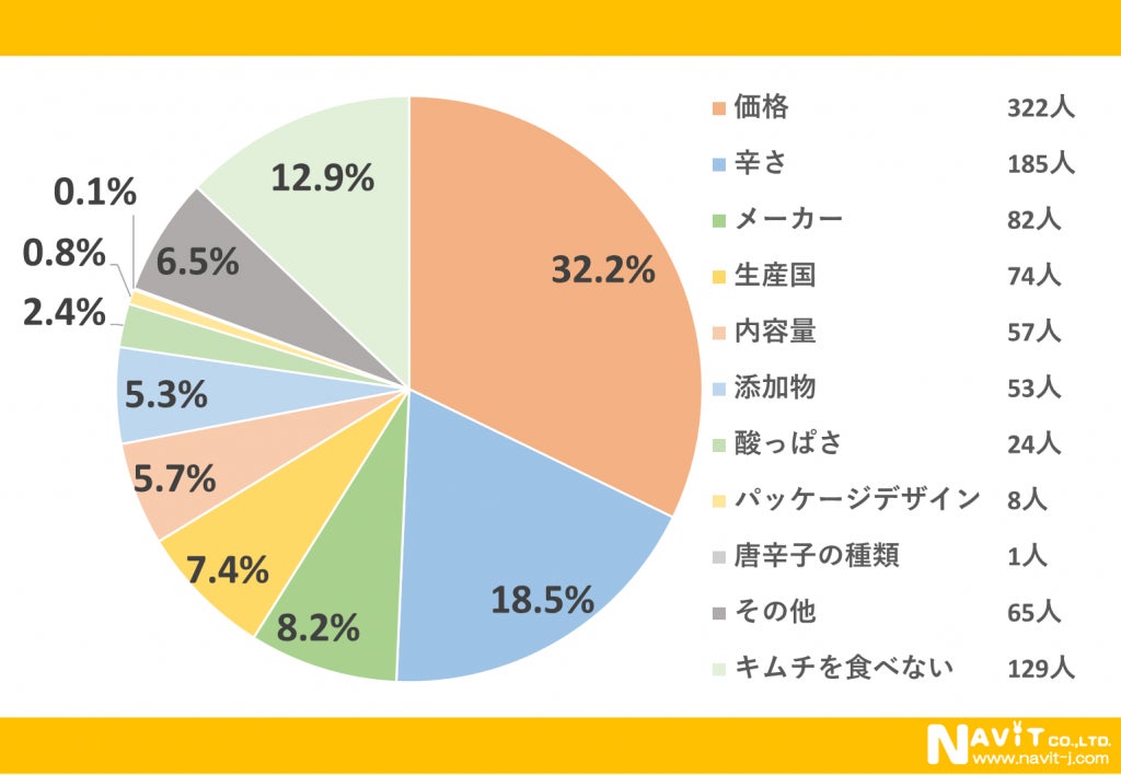 キムチを買う基準については回答がばらつきました。一番多かったのが「価格」で32.2%となっています。次に「辛さ」が18.5%です。やはり辛いものを食べたい時にキムチを食べたくなるのでしょうか。「内容量」が5.7%と続いていいます。