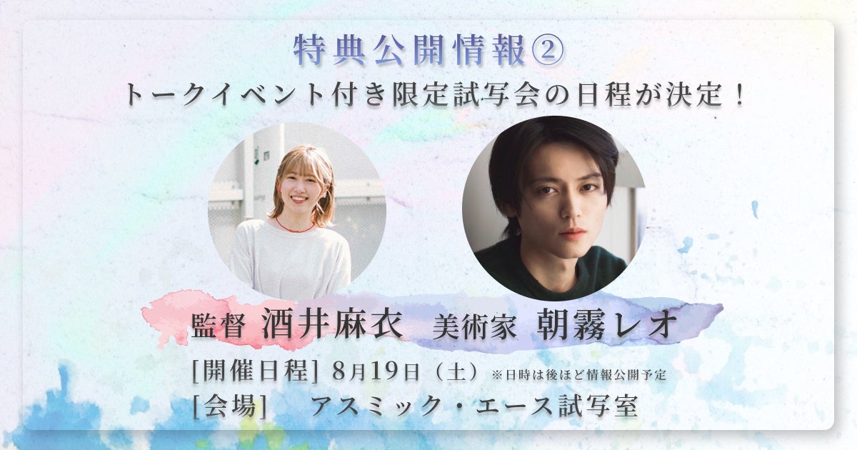 トークイベント付き限定試写会の日程が2023年8月19日(土)に正式に決定いたしました。当日は本作の監督である酒井麻衣監督と本作に登場する絵画を監修した美術家の朝霧レオさんを招き、ここだけでしか聞くことができない映画の制作秘話についてお話いただきます。