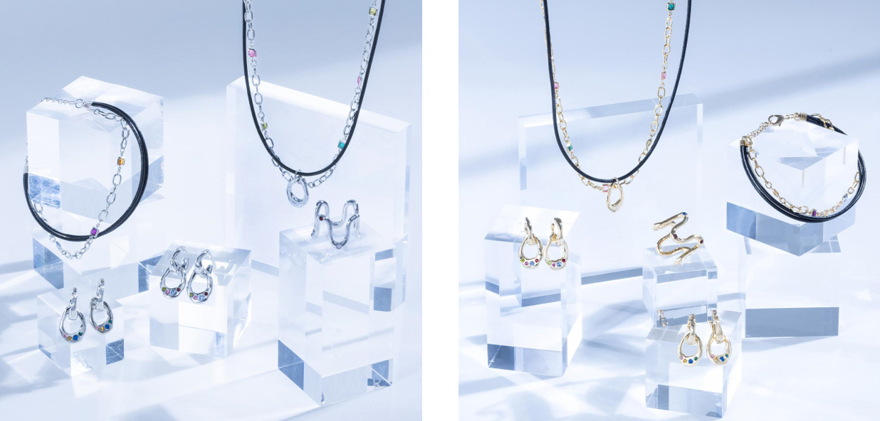 夏らしいカラフルなストーンとチェーンをベースに遊び心のあるフォルムがアクセントになったアクセサリーは10色のカラーが盛り込まれ、カスタム次第で何通りにも楽しめるアイテムとなっています。