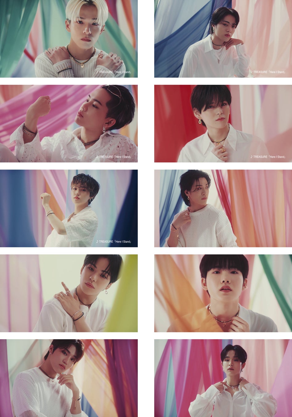 虹のように10色のカラフルなカーテンがなびく、華やかなCM撮影スタジオに現れたTREASURE。ゆらゆらと揺れるカーテンの色が映えるよう、白色で統一したシンプルな衣装が 、TREASUREのアクセサリーの美しさを際立たせます。