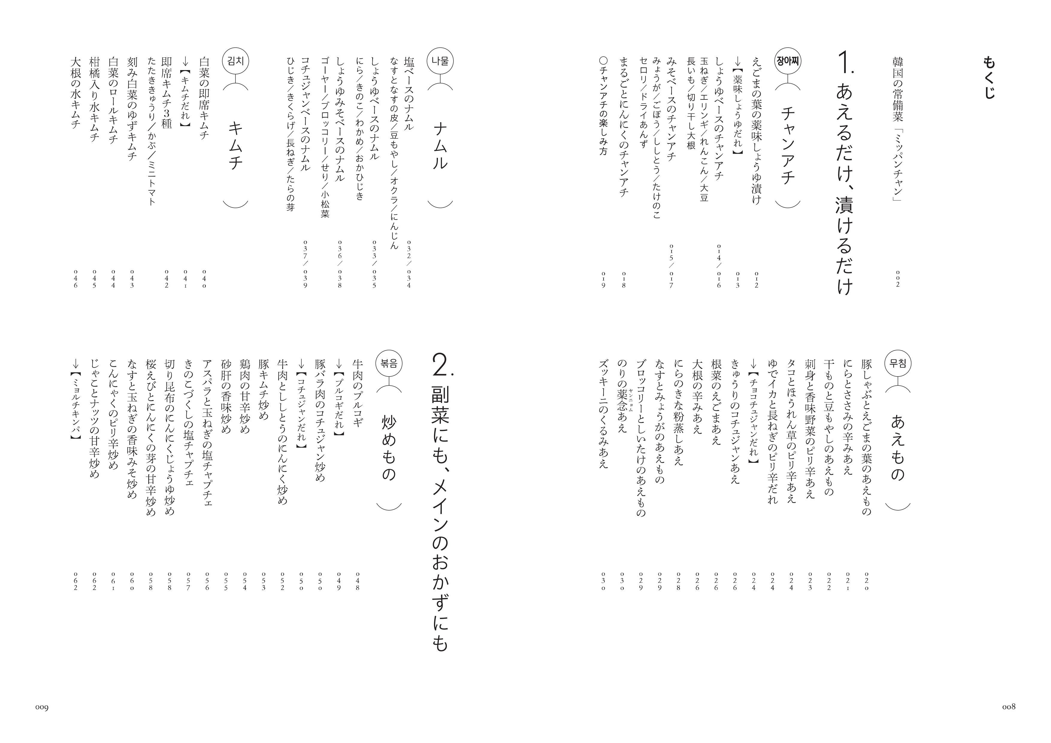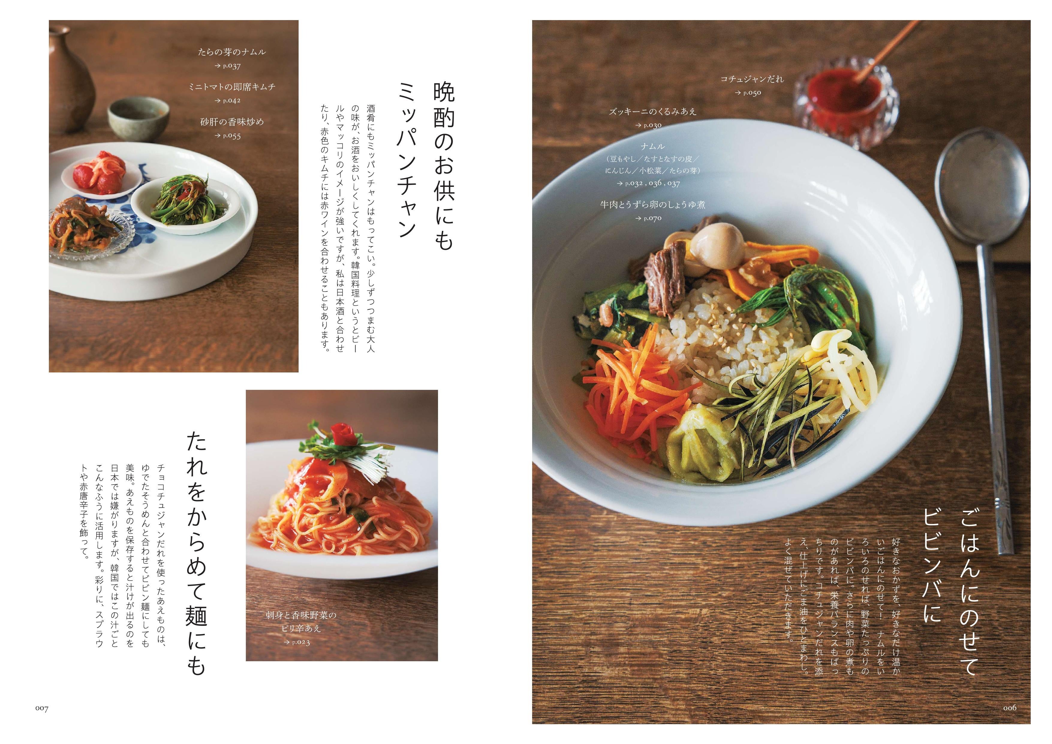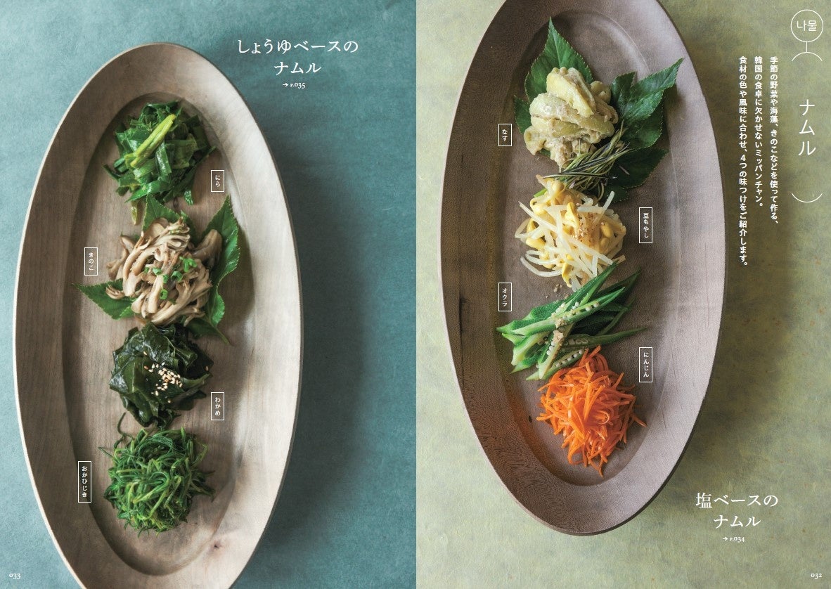 日本でもおなじみのナムルは、季節の野菜や海藻、きのこなど素材に合わせて「塩」「しょうゆ」「しょうゆみそ」「コチュジャン」の4つの味つけで紹介。そのほか、韓国の食卓に欠かせないキムチやチャンアチ(漬けもの)をはじめ、野菜や乾物、豆を使った体にやさしい副菜がズラリ!
