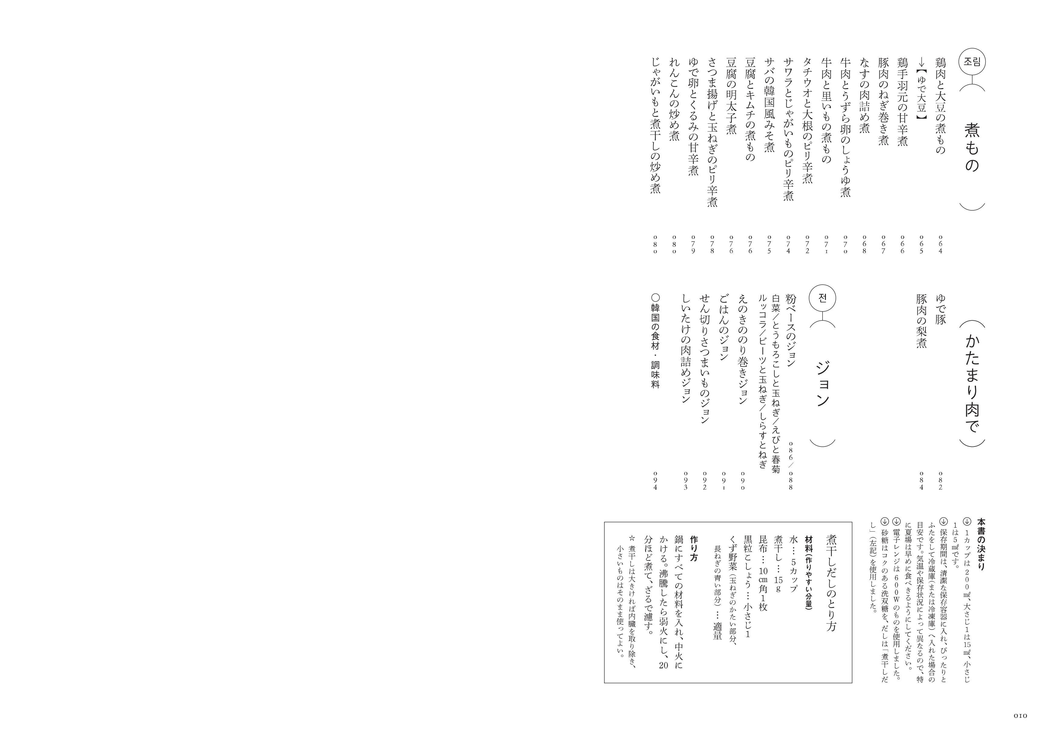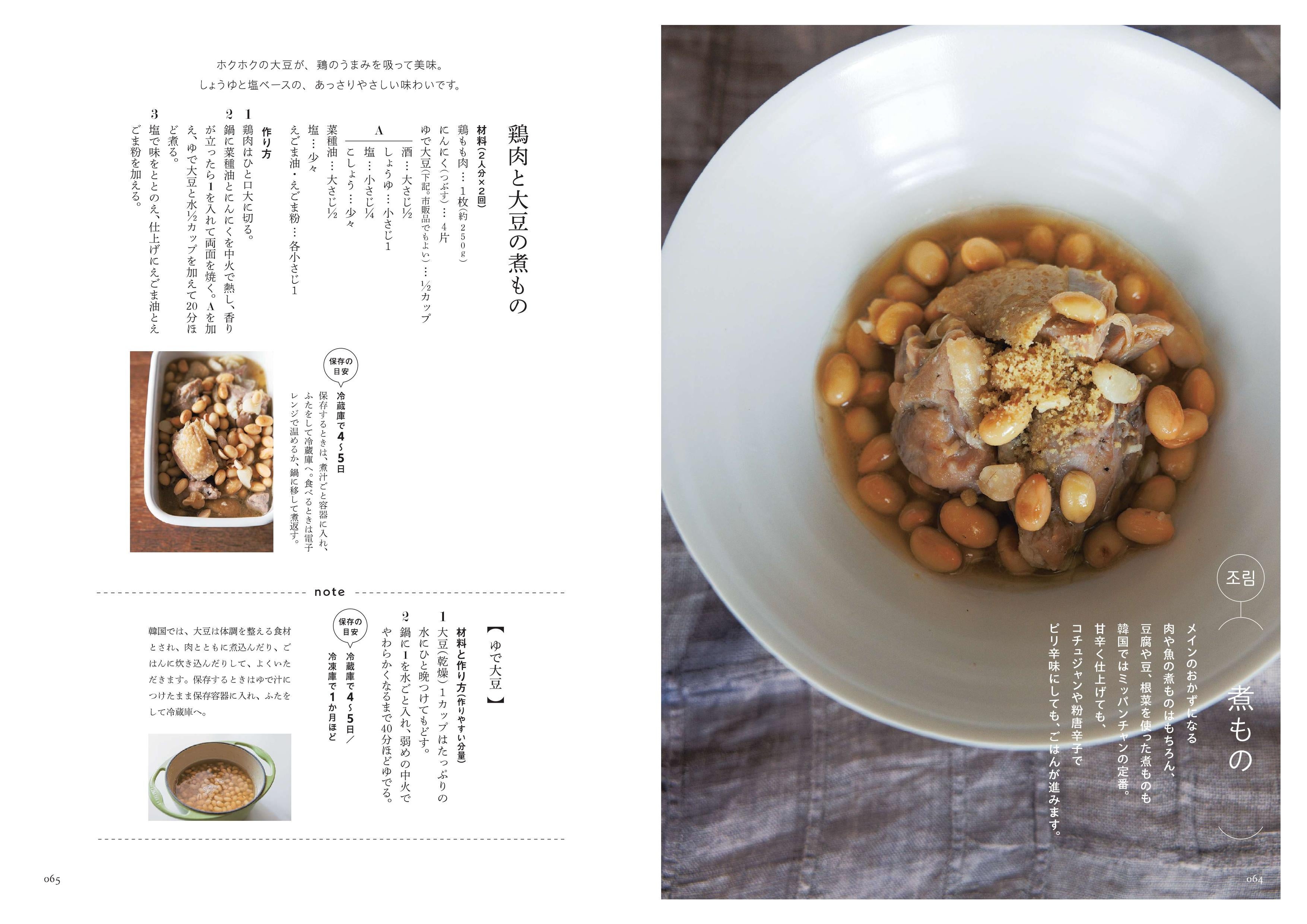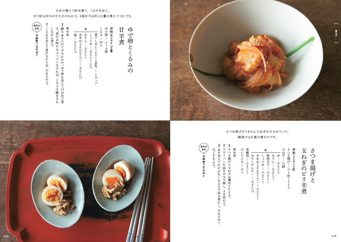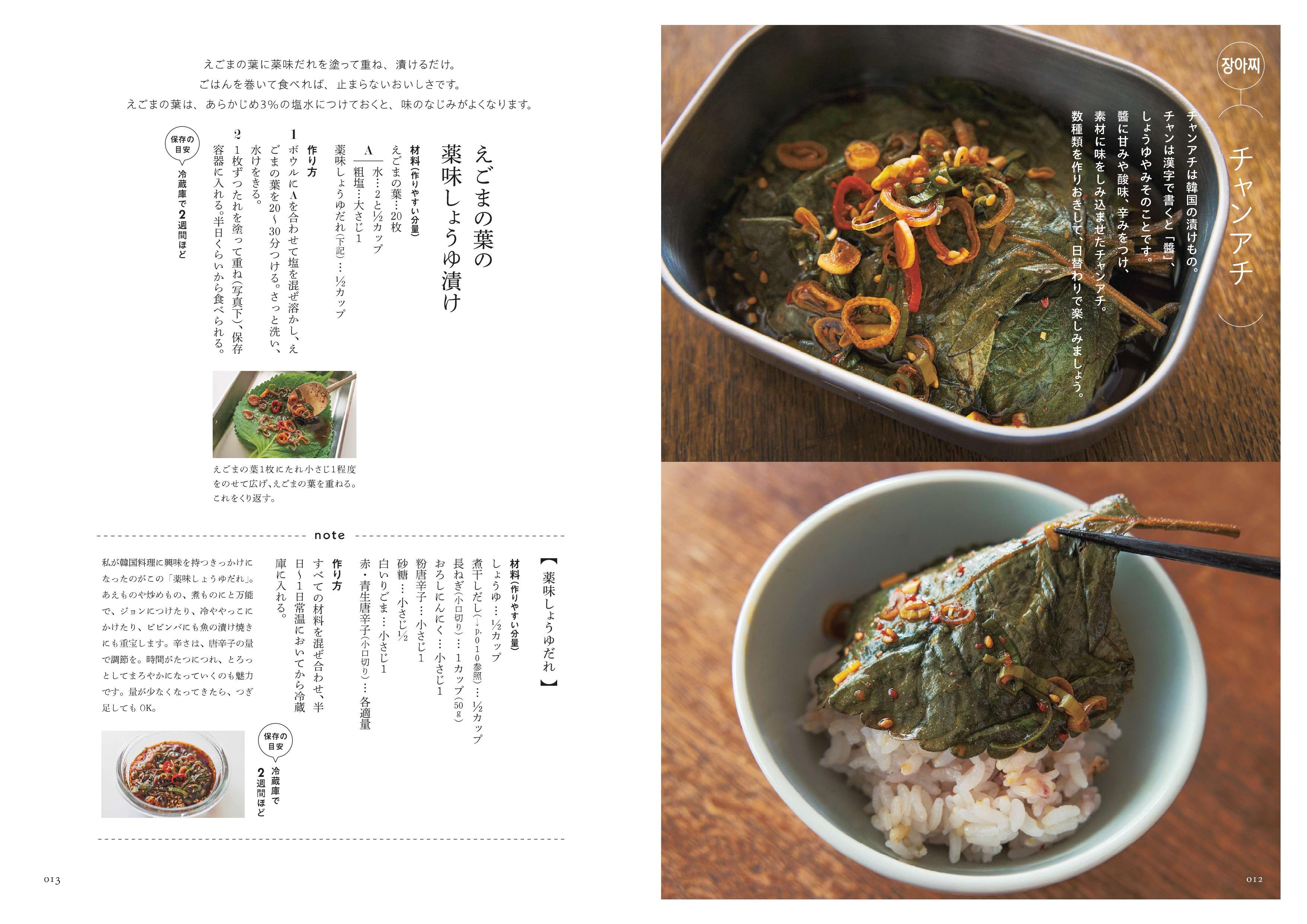 日本でもおなじみのナムルは、季節の野菜や海藻、きのこなど素材に合わせて「塩」「しょうゆ」「しょうゆみそ」「コチュジャン」の4つの味つけで紹介。そのほか、韓国の食卓に欠かせないキムチやチャンアチ(漬けもの)をはじめ、野菜や乾物、豆を使った体にやさしい副菜がズラリ!