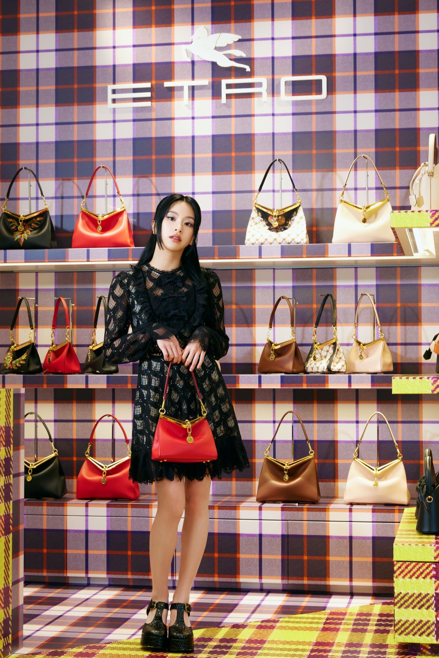 オープンを記念して、ジャパンブランドアンバサダー、TWICEのチェヨンが来店。フローラルのプリントが覗くブラックレースのミニドレスと、伊勢丹新宿店、および公式サイトETRO.com限定カラーのミニヴェラを披露し、色鮮やかなタータンチェックに彩られた店内に華を添えました。