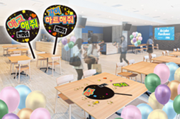 Ariake Fan Baseです。ブース内に用意された飾り付け用の素材(うちわのベース、ハングル文字ステッカー、蛍光ペン等)を自由に使って、オリジナル応援グッズを制作できます。また、アーティストの方に、皆さんに声を届けるオリジナルメッセージボードも設置します。※カフェ内サービスをご利用するにあたっては、INGALIVEオリジナルドリンク「推し色サイダー」をご注文が必要となります。