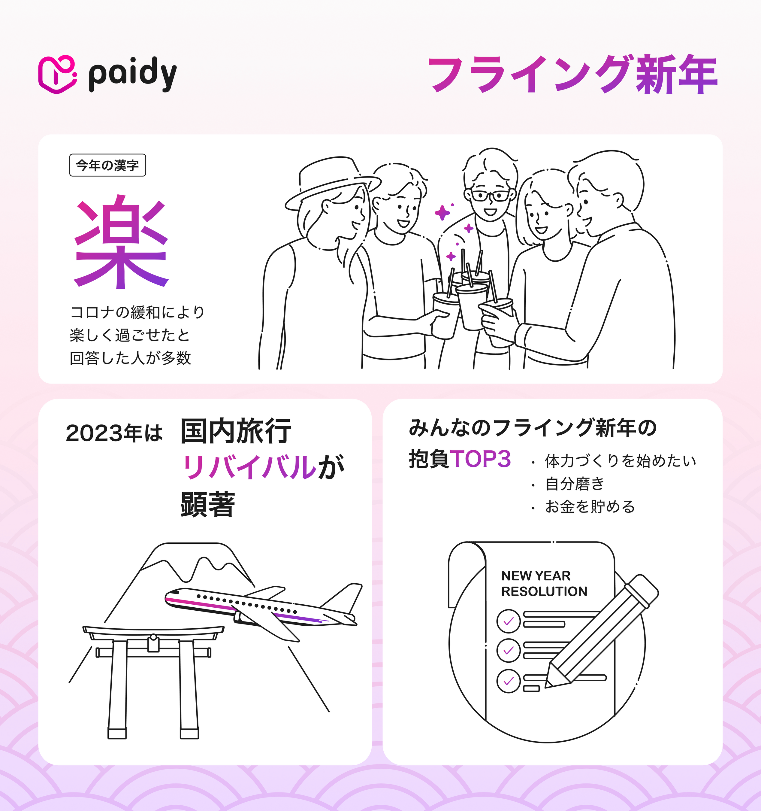 今回、Paidyでは「フライング新年」をさらに盛り上げるため、「2023年の実態と2024年に対する期待」について調査を実施。その結果、コロナ禍を経てフットワークが軽くなり、夢や目標に向けてアクティブに行動する生活者の実態が浮かび上がりましたのでご紹介します。