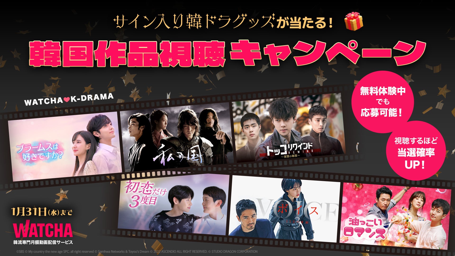この度、韓流専門月額動画配信サービス「WATCHA(ウォッチャ)」は、2024年1月12日(金)から韓国作品を視聴するとサイン入り韓ドラグッズが当たる「韓国作品視聴キャンペーン」を実施いたします。