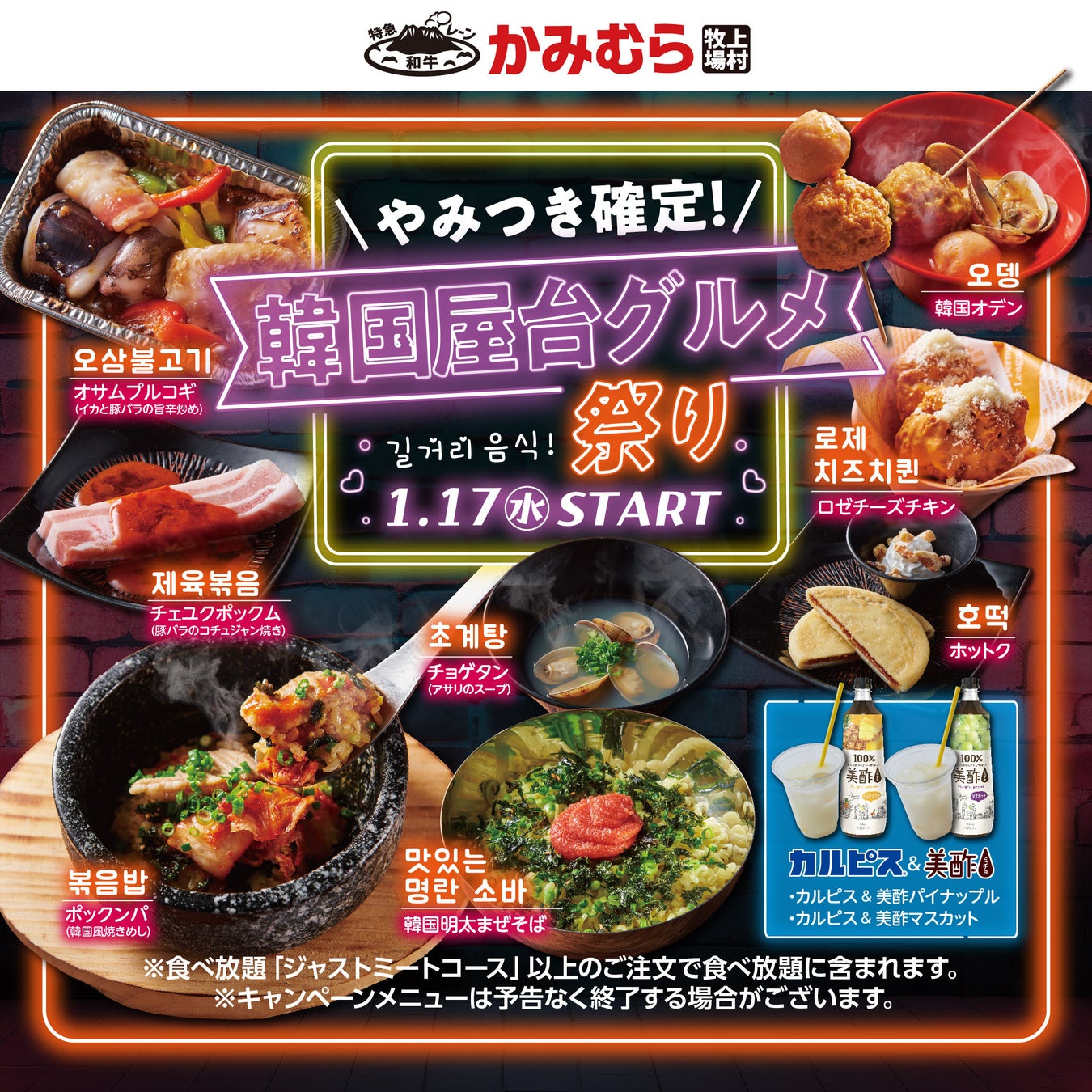 「かみむら牧場」では2024年1月17日(水)から期間限定で、韓国フェアの第2弾として「韓国屋台グルメ祭り」を開催。今回は、新たな8種の「韓国グルメ」メニューに加え、2種の「カルピス&美酢」ドリンクが「ジャストミートコース」以上の食べ放題コースに追加ラインナップとして登場いたします。新しく登場となるのは「ポックンパ」「オサムプルコギ」「チェユクポックム」「チョゲタン」「韓国オデン」など、いずれも韓国の屋台を楽しんでいるかのような8種グルメメニューで、さらに「北海道うまいもん祭り」で好評だった「カルピス」メニューが今回は「美酢マスカット」と「美酢パイナップル」の2種の組合せで新感覚フレーバーをご用意、焼肉食べ放題がさらに楽しくなるバラエティ豊かなラインナップとなっております。(単品メニューとしての販売もしております)