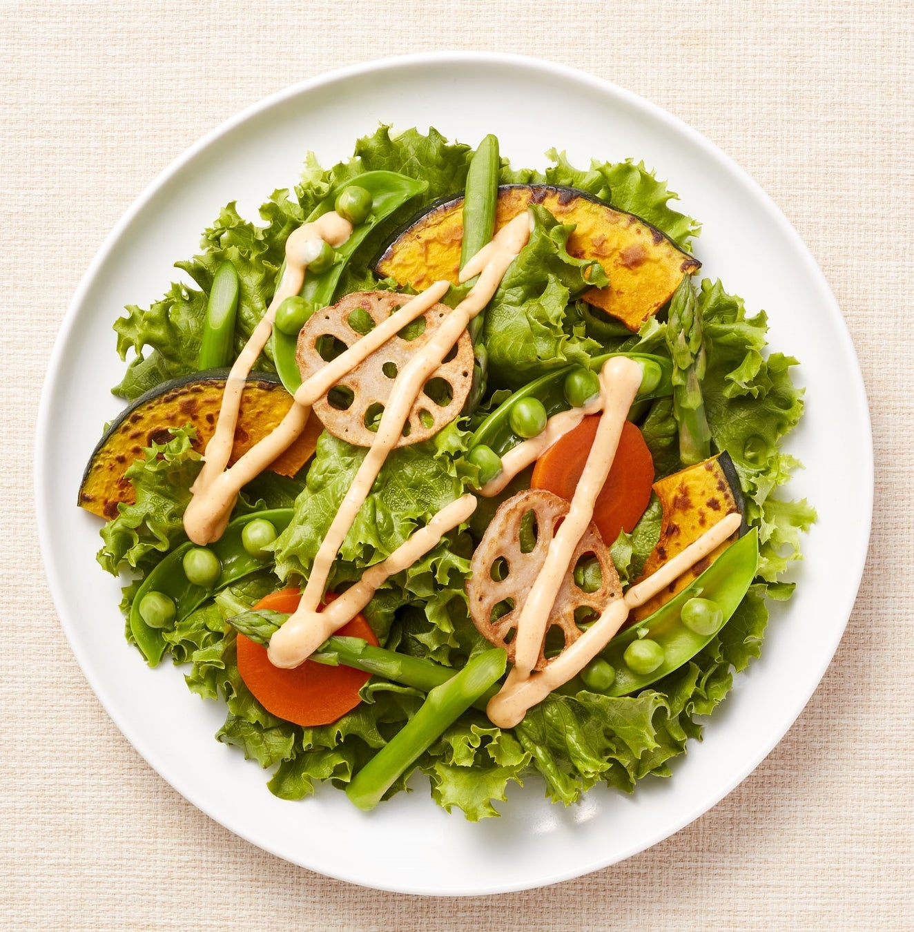 「かける」「和える」「炒める」の調理法と食材を組みわせることで、サラダだけではない野菜料理をつくることができます。