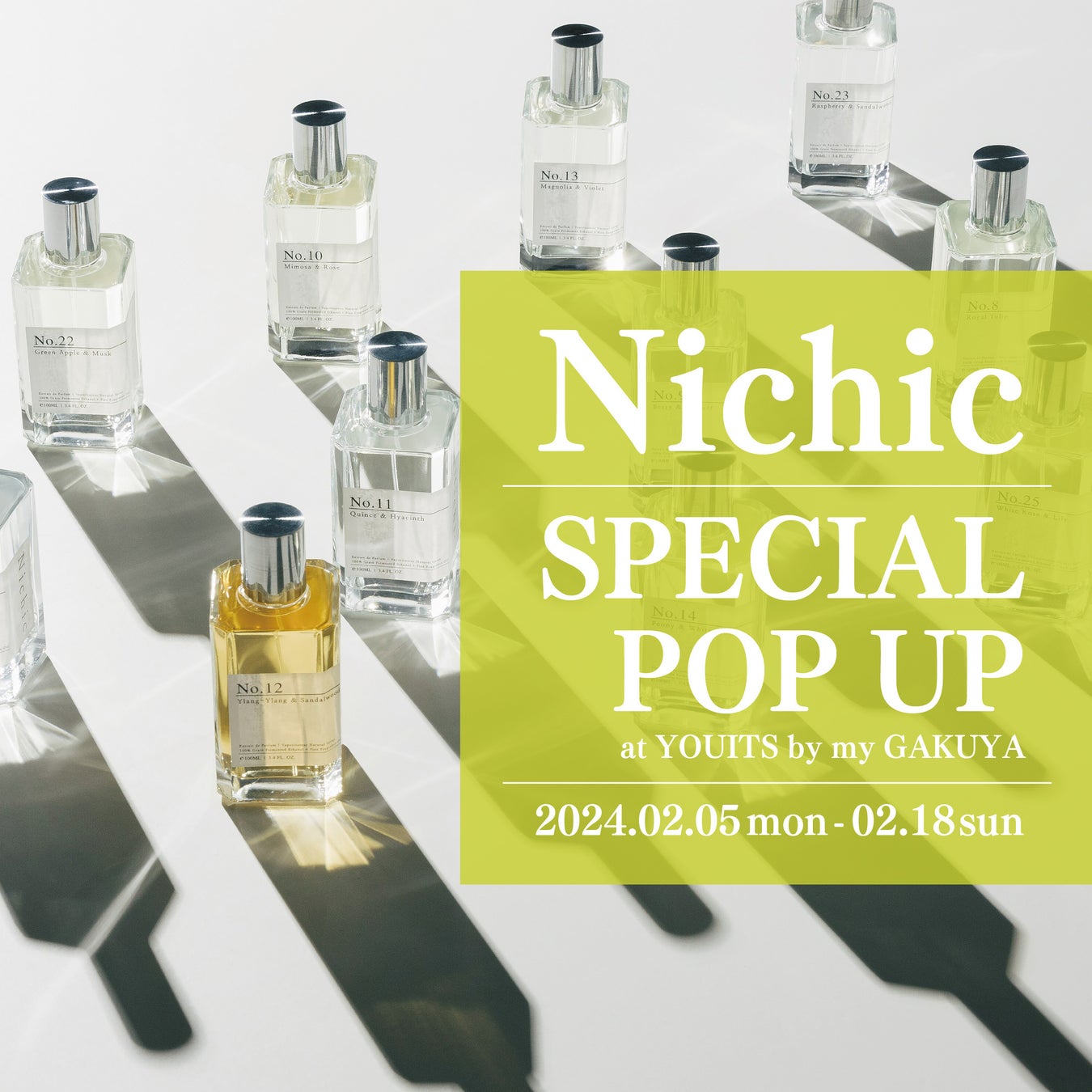 < Nichic x YOUITSの期間限定イベント開催>名古屋の栄で展開する、"まだここにしかないコスメ"を多く取り扱うセレクトショップ「YOUITS」内にて、期間限定のNichic販売イベントを開催致します。オフライン店舗では最多となる17種の香りを体験することができる上、イベント特別価格を最大20%オフでお買い求め頂けます。YOUITSのスタッフが香りの好みなどを丁寧にヒアリングし、あなたにピッタリな香りを提案します。バレンタインギフトをお探しの方、誕生日ギフトをお探しの方も、YOUITSでしか体験できないNichicの香りに出会うチャンスです。