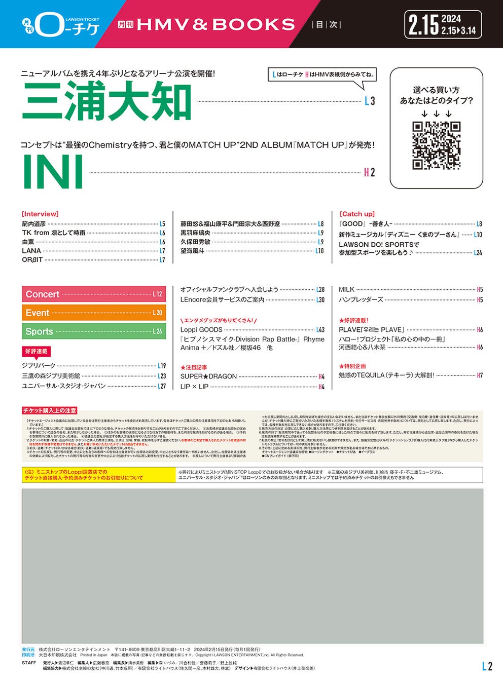 株式会社ローソンエンタテインメントが運営する「ローソンチケット」および「HMV&BOOKS」は、フリーペーパー『月刊ローチケ/月刊HMV&BOOKS』2024.02.15号を、2月15日(木)より、全国のローソンやHMVなどの店頭にて順次配布いたします。