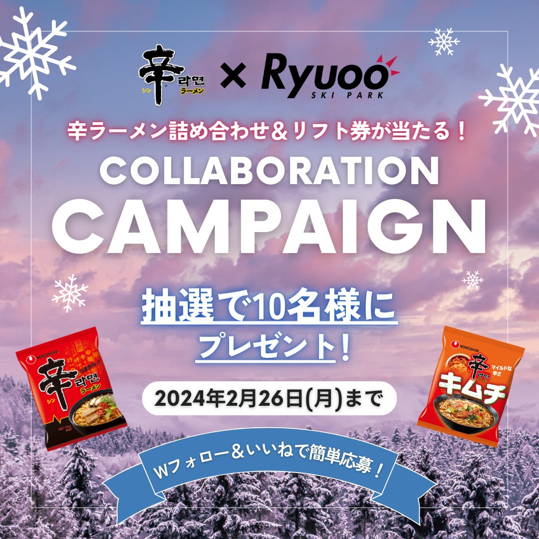 株式会社農心ジャパンは、2024年2月10日(土)より長野県の北志賀エリアで最大規模の広さと標高の高さを誇るスキー場「竜王スキーパーク」内の「SORA terrace cafe」にて、期間限定「辛ラーメン」コラボメニューを提供しています。これに伴い、農心ジャパンと竜王スキーパークの公式SNSにて「コラボレーション記念キャンペーン」を2月16日(金)~26日(月)まで開催します。当社製品詰め合わせセットや「竜王スキーパーク 一日リフト券」等を抽選で10名様にプレゼントします!