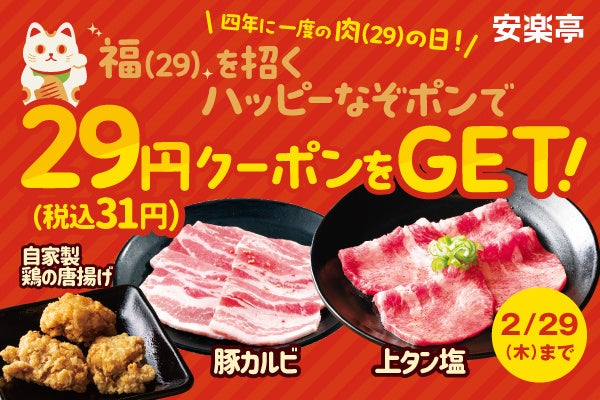 焼肉レストラン安楽亭は、2024年2月23日(金)から2月29日(木)まで、安楽亭のWEBサイトや公式アプリから楽しめる抽選型クーポン「なぞポン」で、上タン塩や鶏の唐揚げなどが特別価格29円(税込31円)で楽しめる「4年に一度の肉の日!ハッピーなぞポンキャンペーン」を開催いたします。