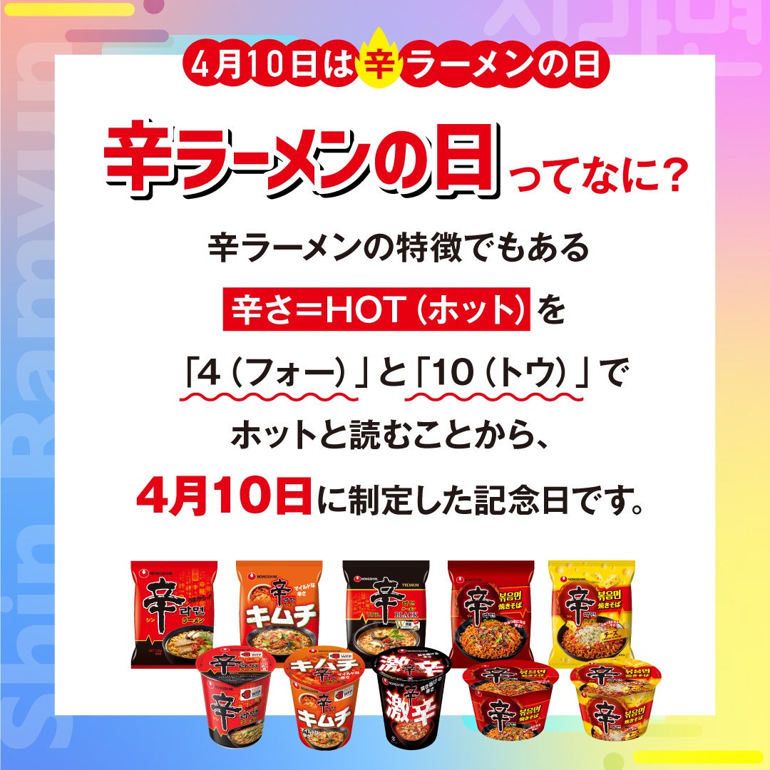 「辛ラーメンの日」は、辛ラーメンの特徴でもある「辛さ=HOT(ホット)」を「4(フォー)」と「10(トウ)」でホットと読むことから、4月10日に制定した記念日です。1986年に誕生した「辛ラーメン」は、様々なラインナップを取りそろえ、製品の特長でもある旨辛さや、様々なアレンジレシピがSNSを中心に人気を博しています。