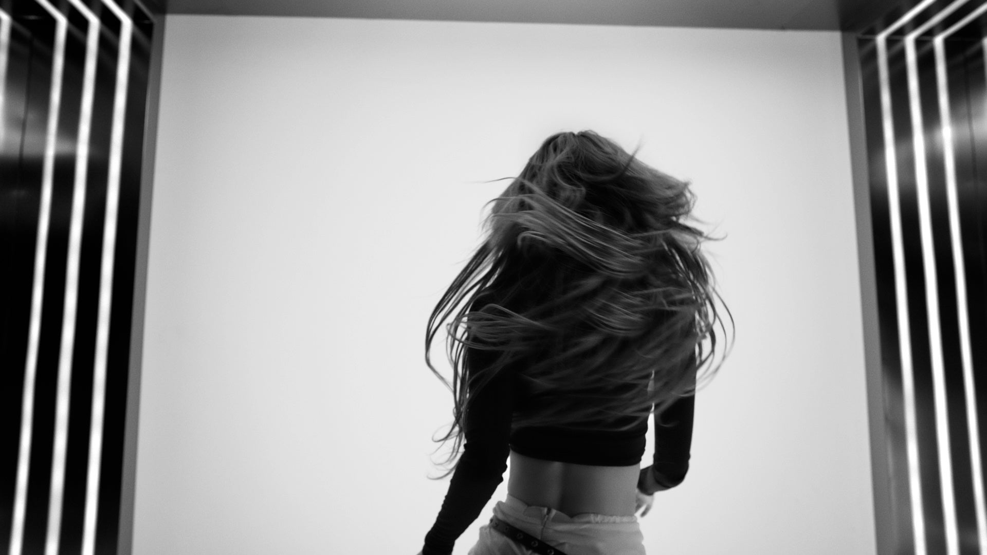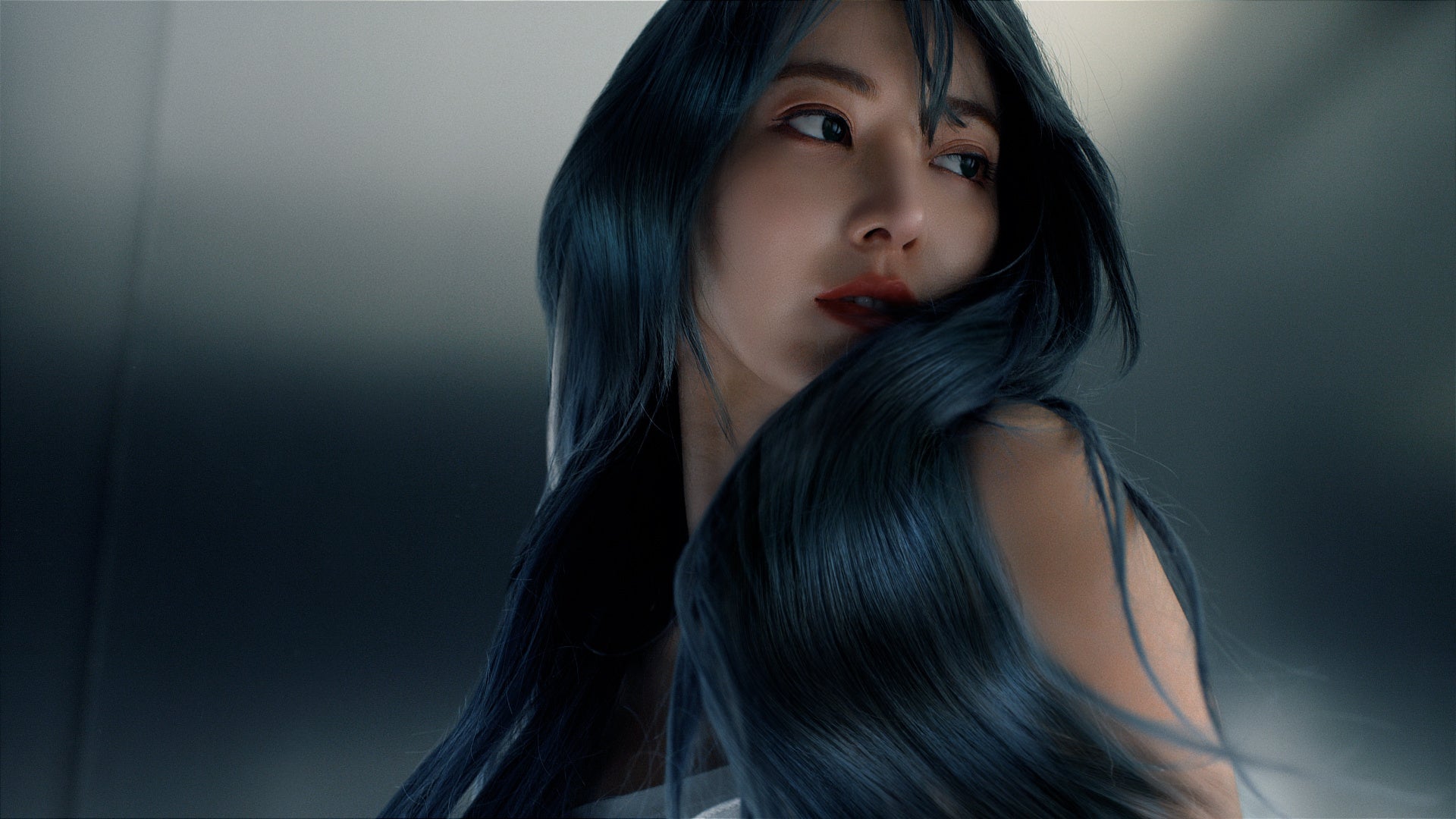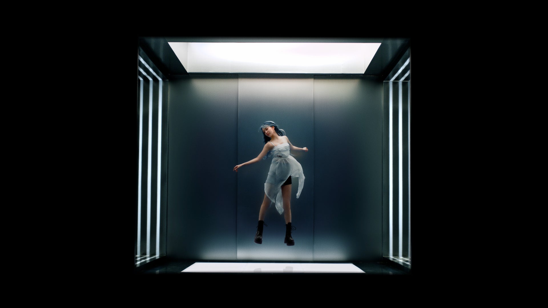 無機質で近未来的なボックスの中に浮遊する宮脇咲良さん。荘厳なクラシック音楽とビートミュージックが融合したBGMが流れ出すと、ブルーの美しいロングヘアを自由自在に操ります。モノクロ映像が組み合わされたスタイリッシュな映像表現で宮脇咲良さんのパフォーマンスが際立ち、まるでSF映画のワンシーンのような仕上がりに。
