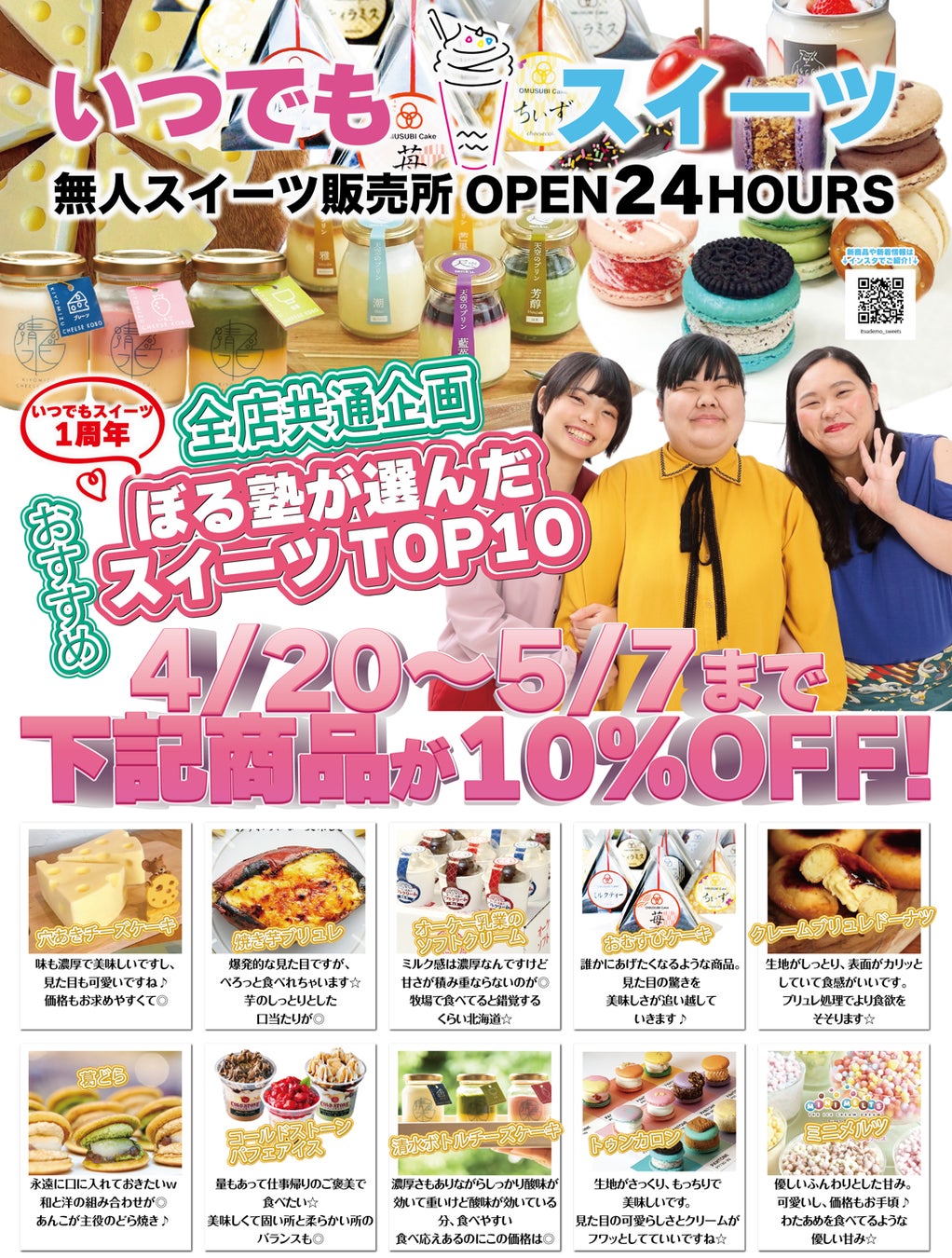 4⽉20⽇〜5⽉7⽇ いつでもスイーツ全店舗にて、期間限定10%offで販売中です!!
