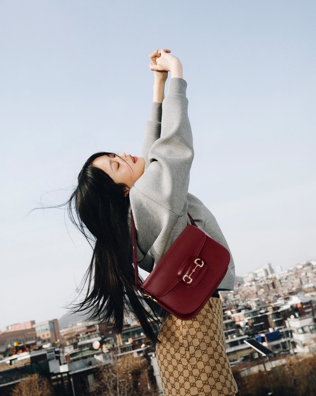 今回の広告キャンペーンでは、乗馬の世界につながりのあるグッチの伝統を物語るシンボルであるホースビットの色褪せないレガシーをたたえています。馬具から取り入れたこのダブルリングとバーからなるモチーフは1950年代にグッチを象徴するコードとしての地位を確立し、その後もバッグ、シューズ、ベルト、ジュエリー、シルク製品、ウェアのディテールとしてグッチのコレクションを彩り続けています。端正なシルエットからエレガントな魅力を放つ〔グッチホースビット1955〕バッグは、グッチの乗馬にまつわる物語を語り、卓越したクラフツマンシップの証となることで、伝統を現代へとつなぐ架け橋となっています。ハニは2022年以来、〔グッチ ホースビット1955〕バッグに彼女自身のフレッシュな魅力をもたらしています。今回はソウルの街をめぐり、自然体のさりげない瞬間を捉えた映像や写真を通して、クラシカルでありながらさまざまなシーンで活躍するこのアイコニックなバッグのコンテンポラリーなスピリットを体現しています。