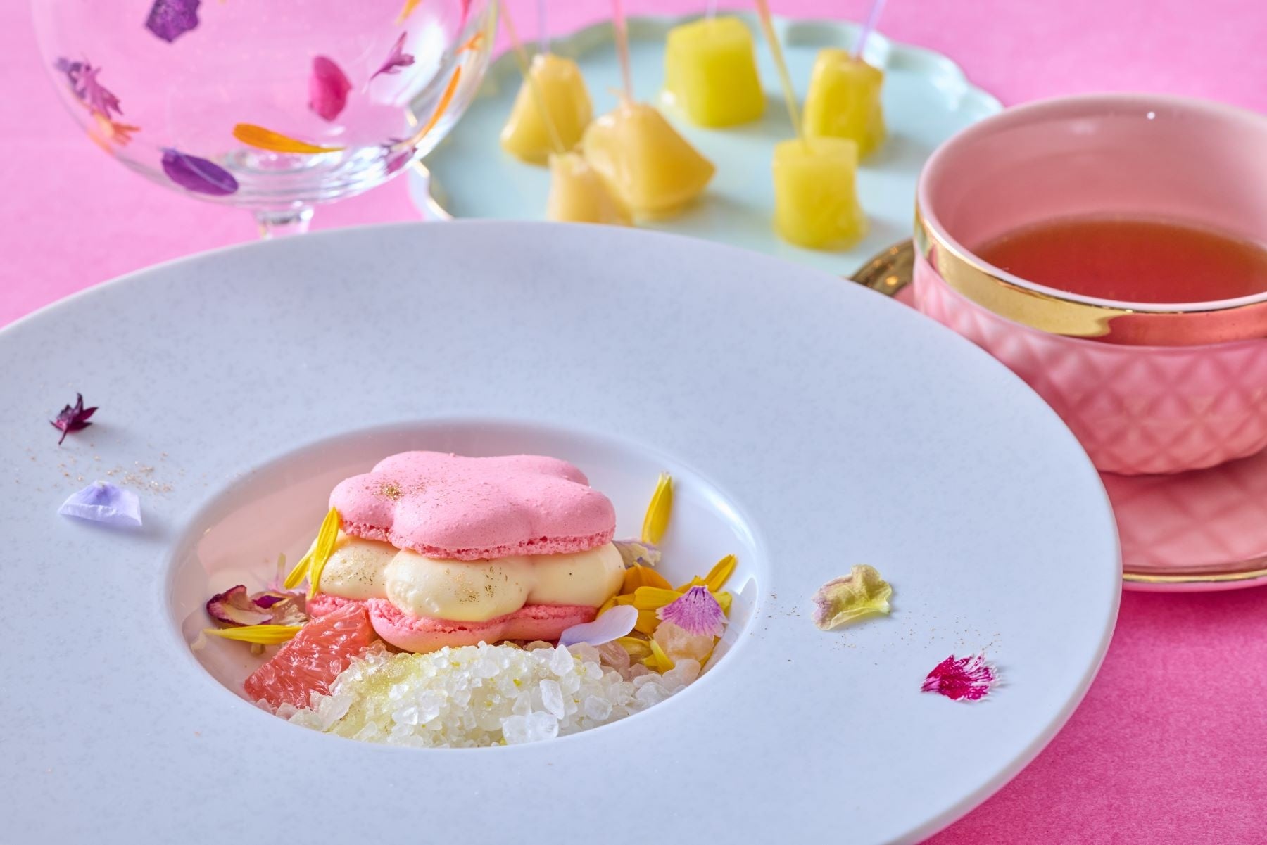 スイーツは、エルダーフラワーのグラニテが添えられたトゥンカロンをスプーンで崩し、様々な食感と風味を体感できる、ひとり一皿のスペシャリテを提供。ドリンクに入れても映える、季節のフルーツを使用したタンフル(フルーツ飴)もご用意しております。