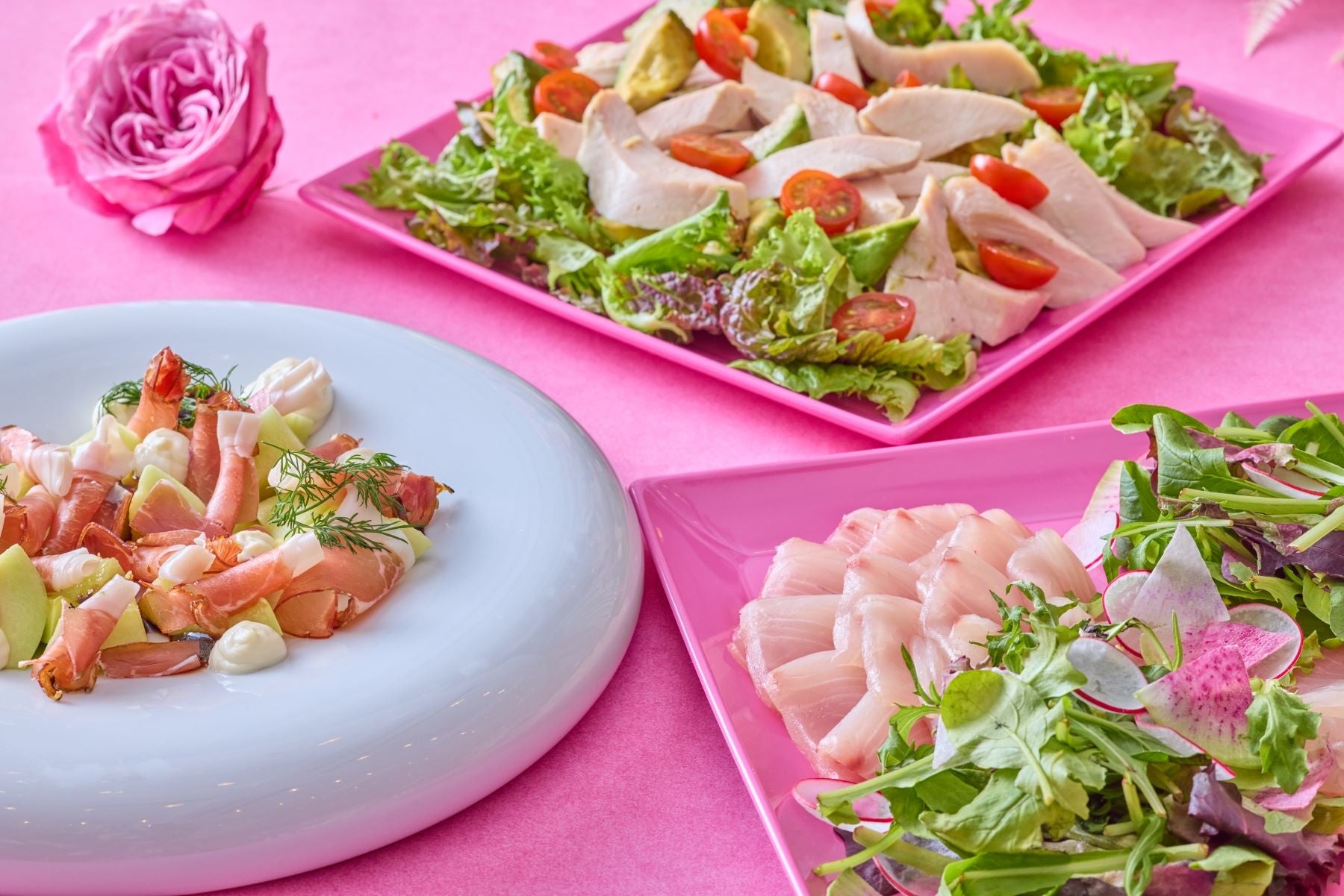チャメと生ハムの冷製 クリームチーズとバルサミコ酢を添えて/カンパチとベビーリーフのチョレギカルパッチョ/茹で鶏とアボカドのサラダ 韓国海苔のアクセント/サーモンとキムチのタルタル 豆乳のムース/ライムが香るエビ塩豆乳冷やし麺