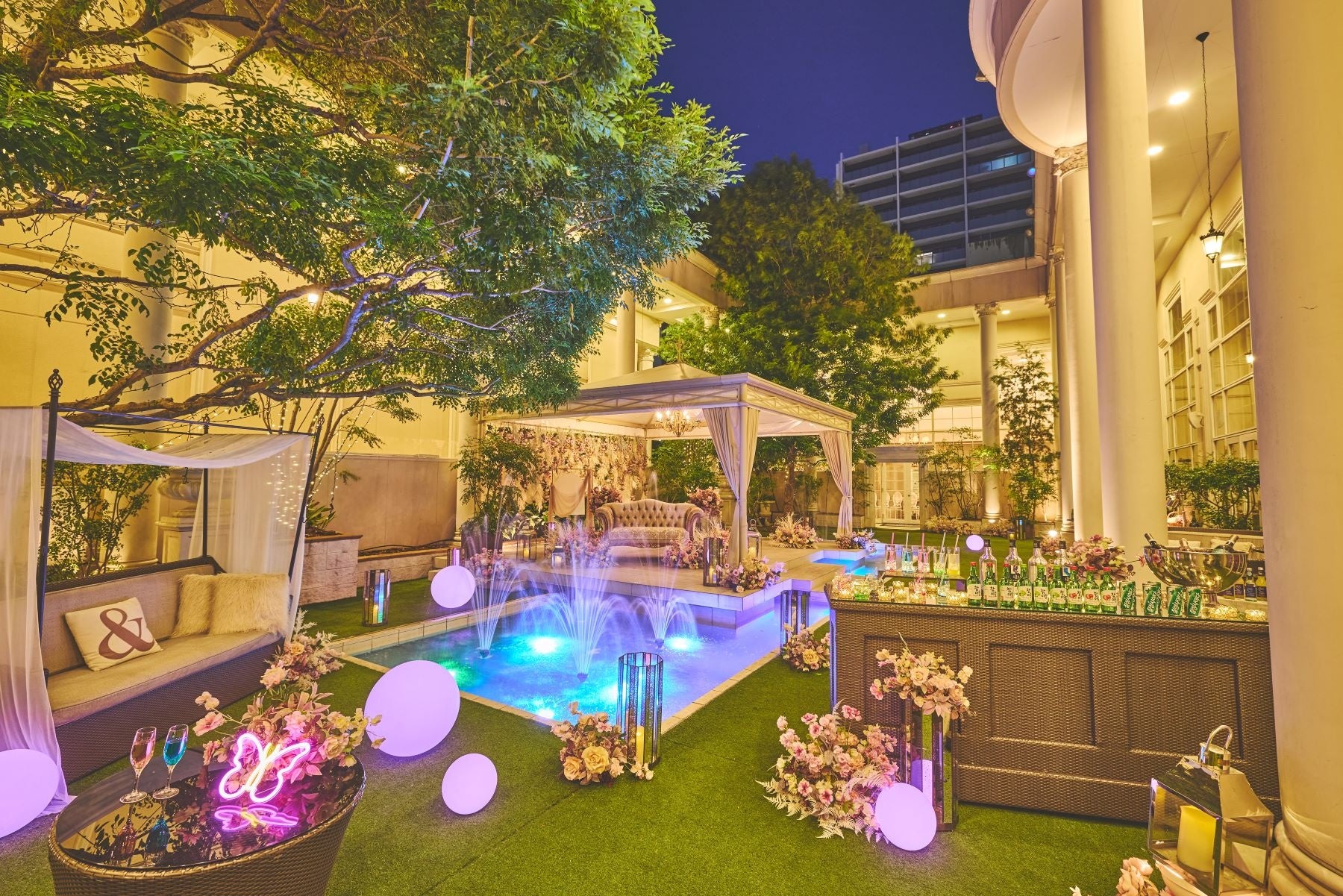 プール付きのガーデンや、シャンデリアが煌びやかな会場は、ネオンやキャンドルで彩られ、夏の贅沢なひとときを演出。女子会や会社でのお集まり、デートなど、様々な用途で非日常感じる特別な時間と空間をお過ごしください。