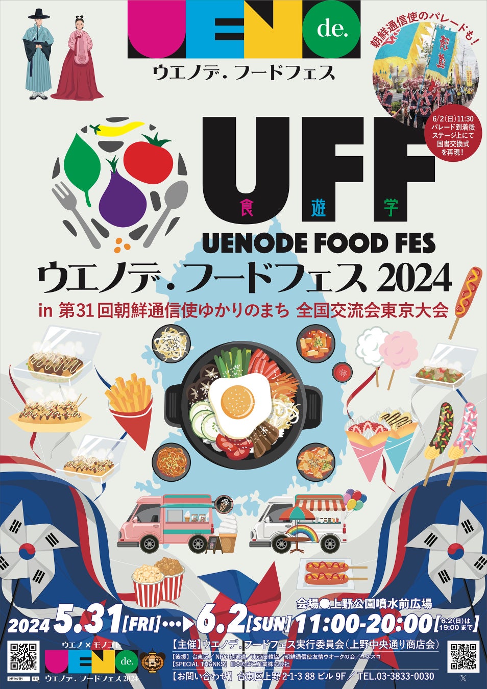 「ウエノデ.フードフェス2024in第31回朝鮮通信使ゆかりのまち全国交流会東京大会」は、「食」「遊」「学」の3つのテーマを融合させた地域・国際交流イベントです。世界記憶遺産に登録され日韓友好の歴史的資産である朝鮮通信使を知って頂くことを目的に、上野の商店街や全国のご当地グルメなど、美味しいお食事を味わっていただきながら、 伝統舞踊、アイドル、K-POP、演歌、トロットなどの日韓混合のエンタメで盛り上がることで大切な家族や友人たちと一緒に過ごす場所と機会をご提供致します。入場料無料で開催致しますので、どなたでもお気軽にご参加ください。