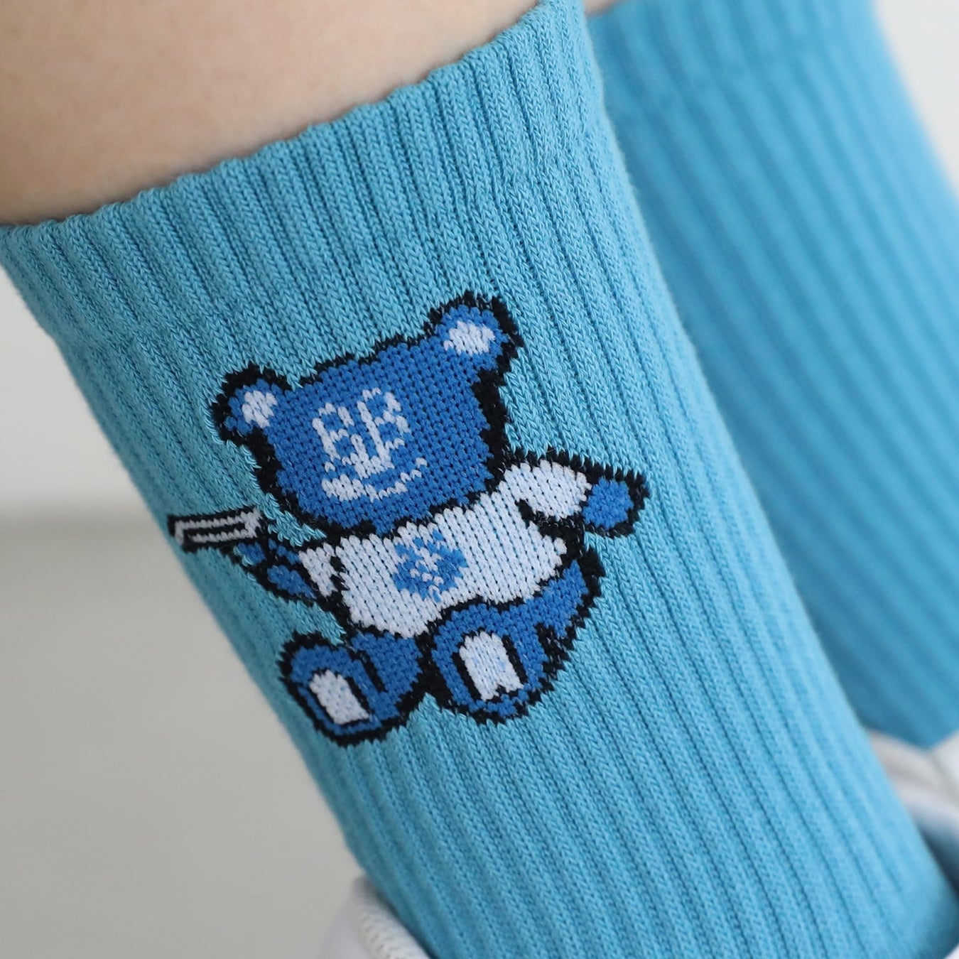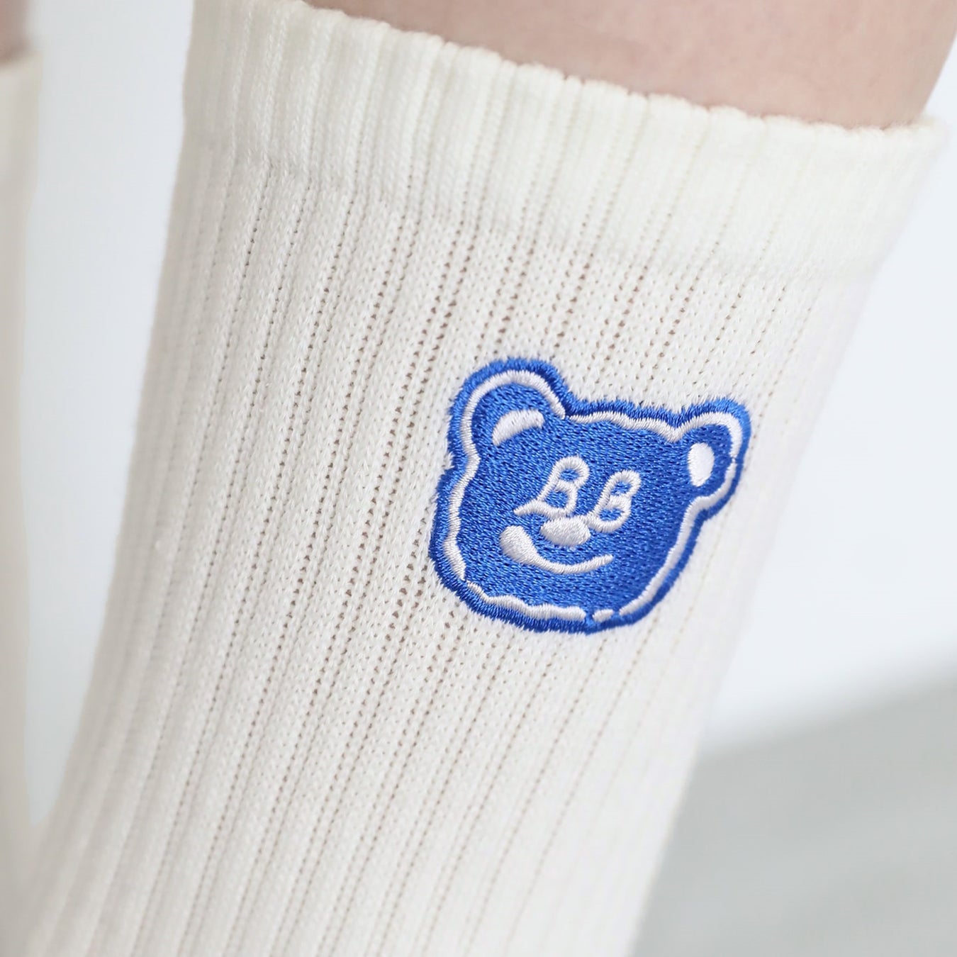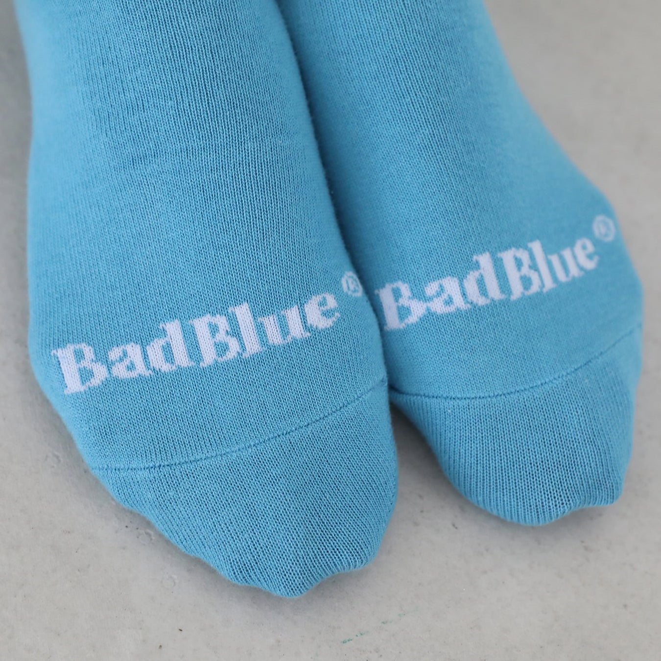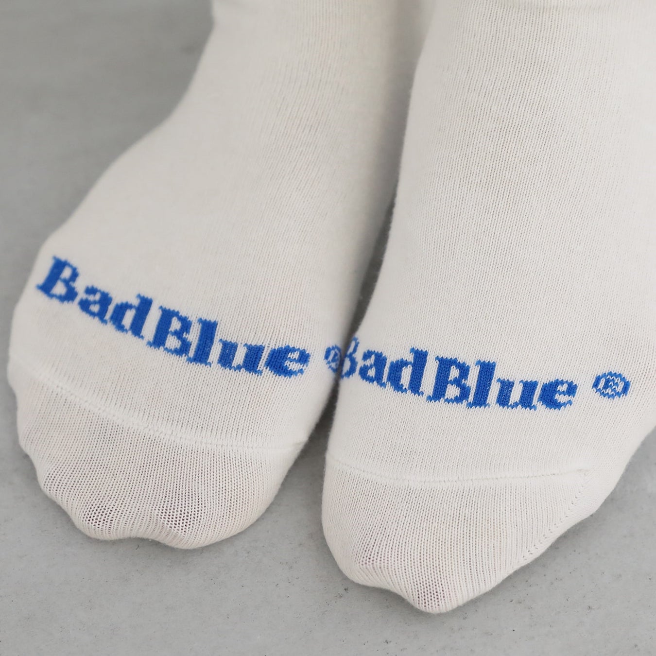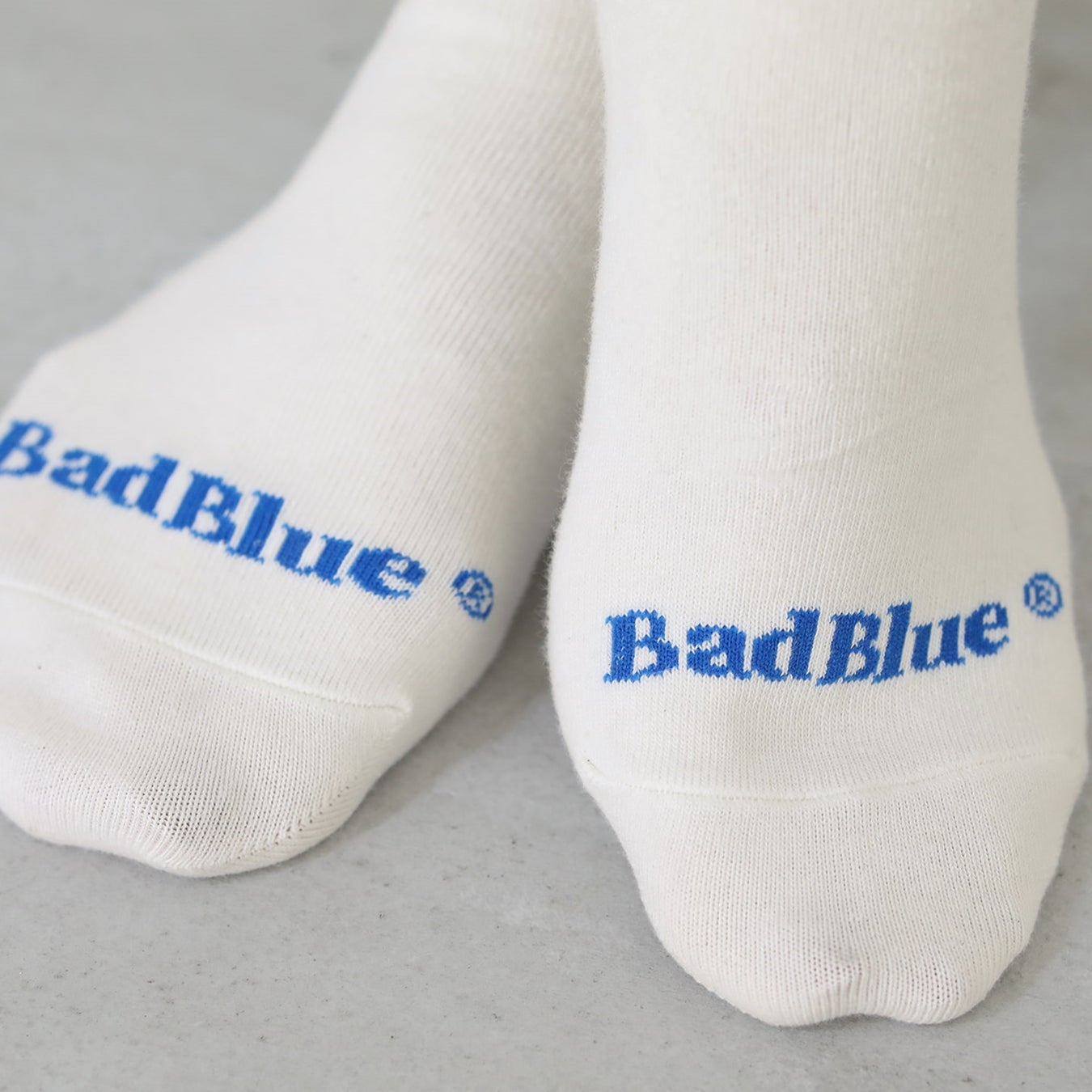 コラボ商品として今回企画したのは、いずれもつま先に“BadBlue”のロゴが入った、サイドリボンクルー、BadBear 刺繍クルー、BadBear クルーの3タイプ(サイズ:各22.5~24.5㎝)。サイドリボンやキャラクターBadBearの刺繍などの加工とブルー系のカラーを利かせた配色により、BadBlueの世界観をソックスで表現します。