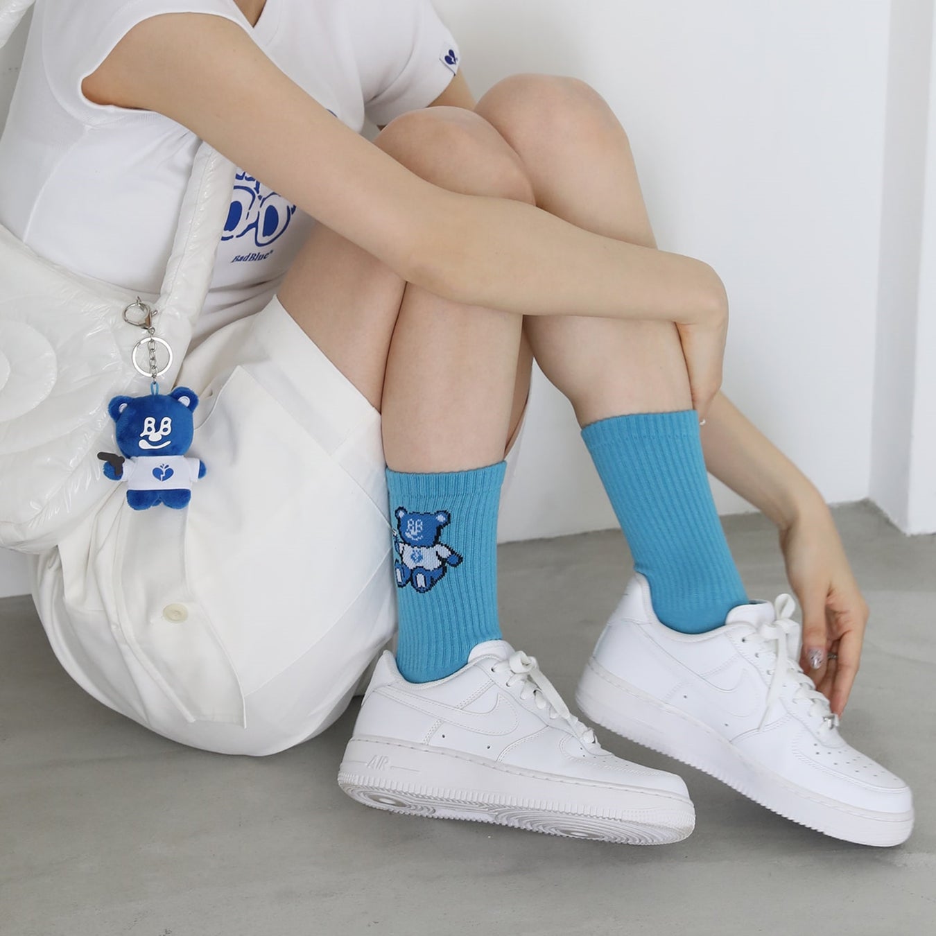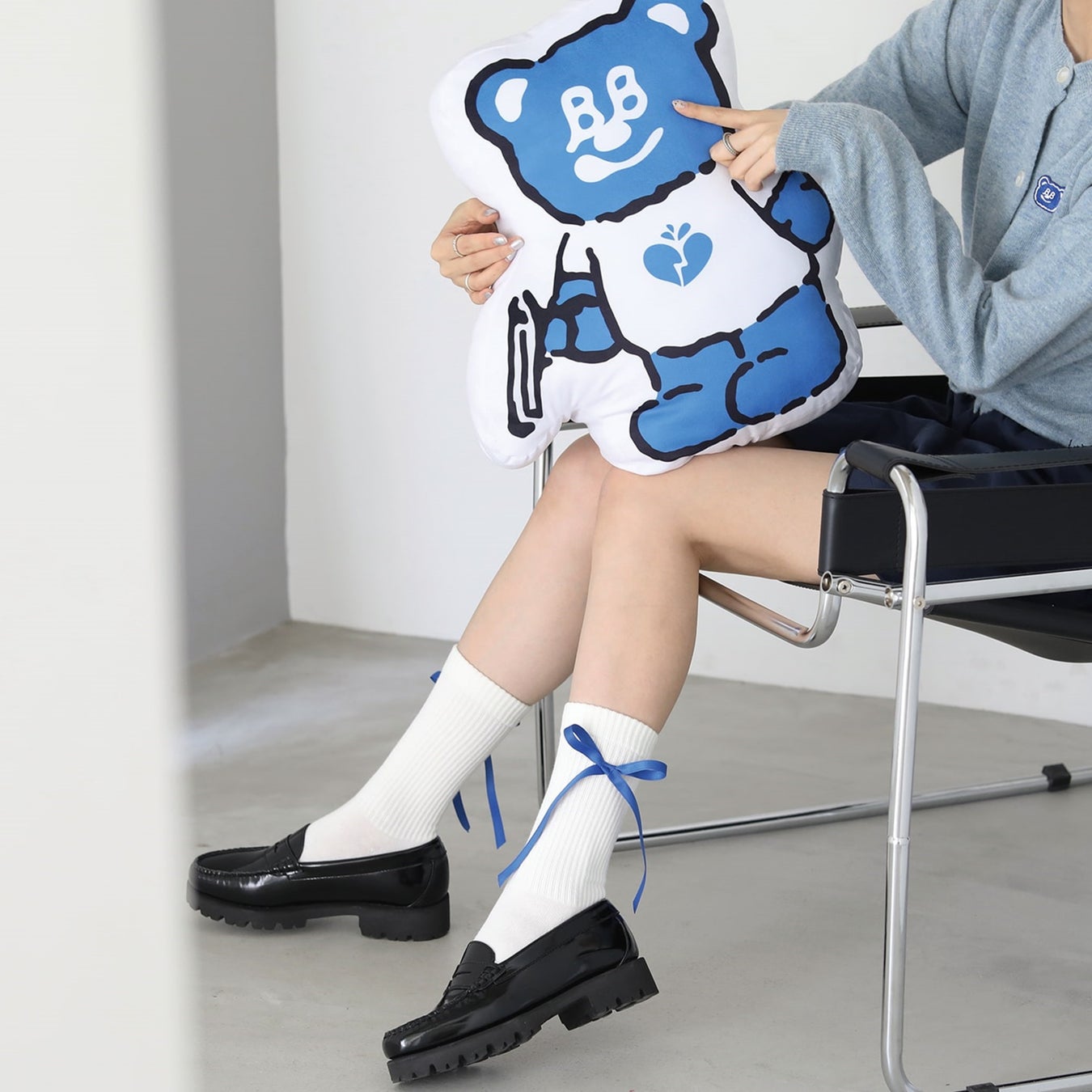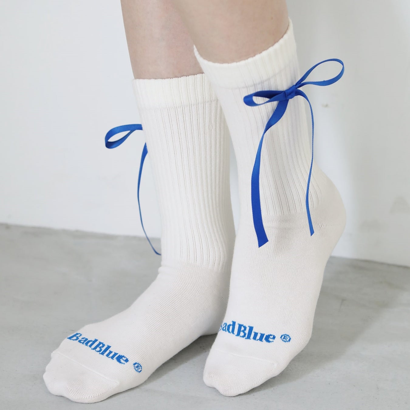 BadBlueカラーのリボンとカジュアルなリブソックスのバランスが可愛い1足です。