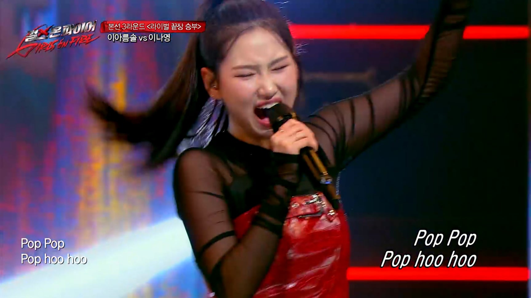 第3ラウンドのミッションは「1対1で一曲を歌い、競い合う“ライバルとのガチンコ勝負”」。自らがライバルを指名して選曲や編曲のアイデア、衣装のコンセプトなどステージに関わるすべてを自分たちで創り上げます。第6話では、第1ラウンドで話題を呼んだ、HYBEオーディションで6000分の1となった女神イ・ナヨンVS「韓国ミュージカルアワード」助演賞イ・アルムソルの対決が再び行われます。イ・アルムソルは第1ラウンドの雪辱を果たすため、対戦相手にイ・ナヨンを指名。ステージでは圧倒的な歌唱力を披露しましたが、それまで感動的な舞台を魅せてきたイ・ナヨンが唸り声を披露するなど新たな実力が高く評価され、再びイ・アルムソルは敗北しました。審査員のユン・ジョンシンは、一歩も譲らない二人のステージを「まさに『GIRLS ON FIRE』だ。」と称賛しました。