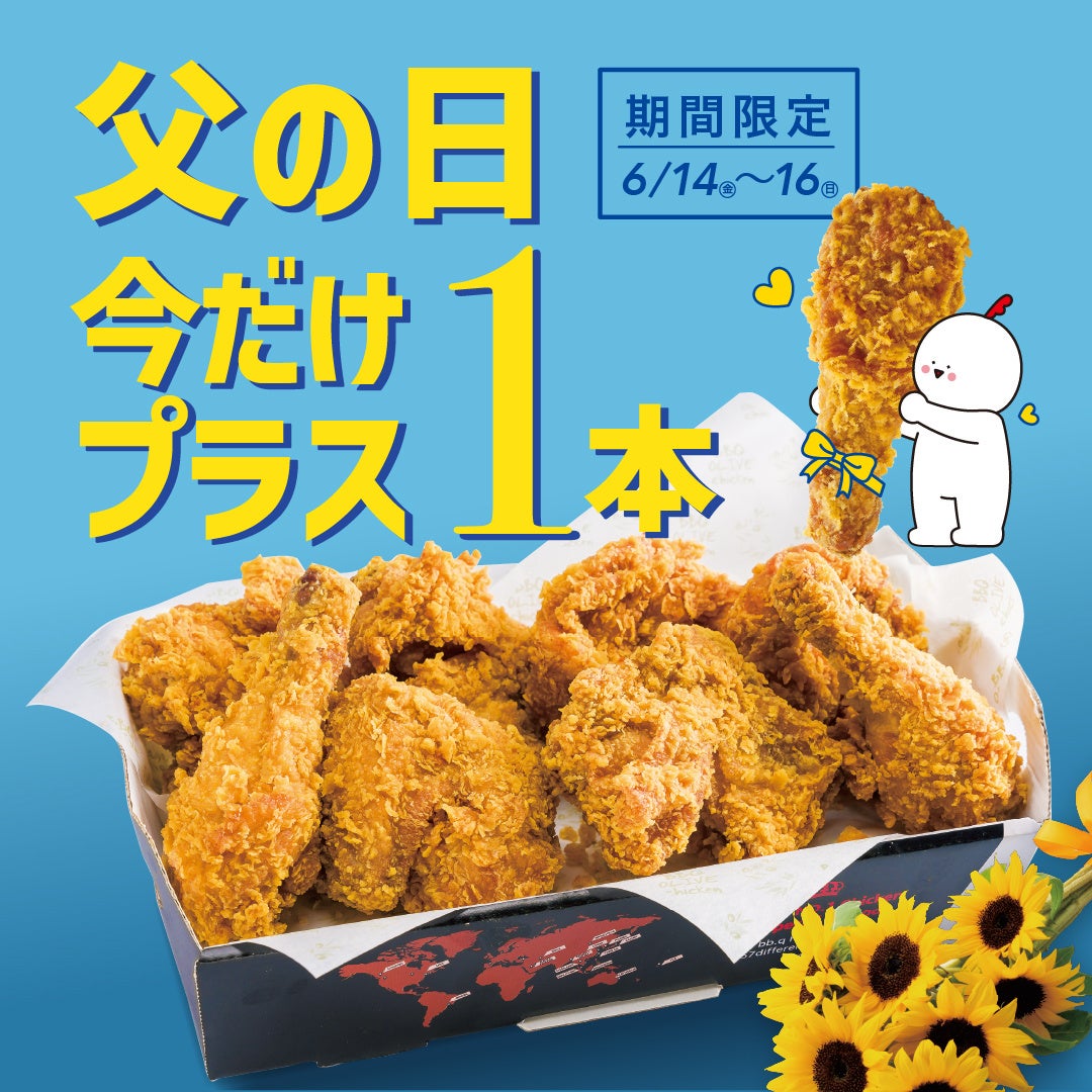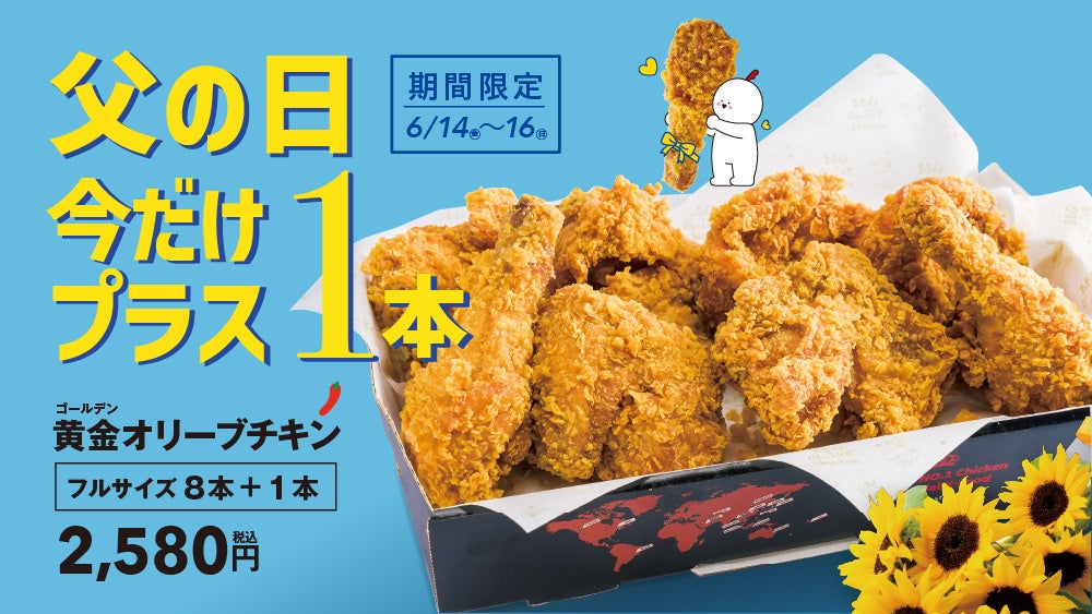 『オリーブチキンカフェ」では、父の日を迎える6月14日(金)~6月16日(日)の3日間限定で、韓国一番人気の『黄金オリーブチキンボックス(フルサイズ8本入り)』が+1本増量した9本入りで販売中です。家族みんなで分け合っても大満足のボリュームになった『父の日黄金オリーブチキンボックス』(2,580円税込)で父の日の家族の食卓を彩り、素敵なひとときをお過ごしください。