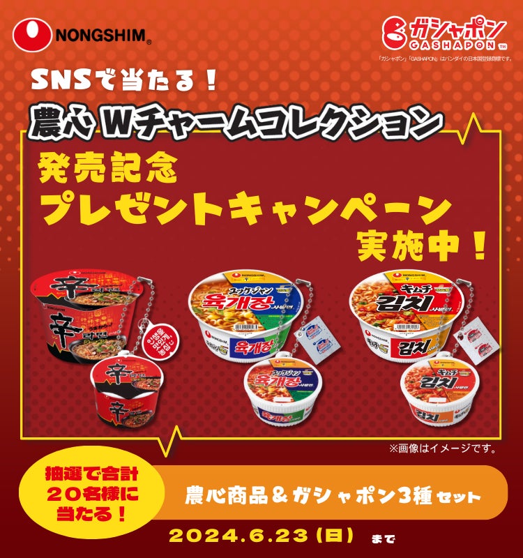 第5弾の発売を記念して、6月17日よりガシャポン®と商品のセットが当たるSNSキャンぺーンを実施します。『農心Wチャームコレクション』の中から、「辛ラーメン バケツカップ」「ユッケジャンラーメン カップ」「農心 キムチサバル麺 カップ」の3種を確実にゲットできるので、コンプリートも夢じゃないかも?
