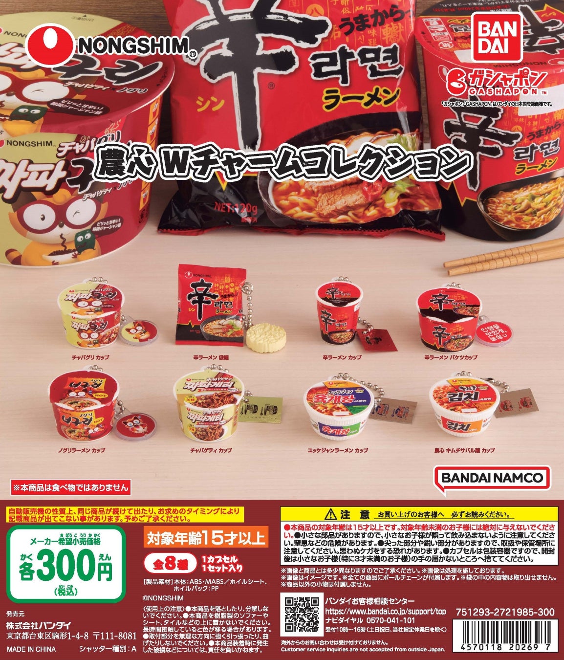 株式会社農心ジャパンは、株式会社バンダイ(本社:東京都台東区)のカプセルトイブランド「ガシャポン®」とのコラボ商品『農心Wチャームコレクション』を開発しました。2024年6月3週目より順次発売し、全国の玩具売場・量販店・家電店などに設置されたガシャポン自販機にてお買い求めいただけます。2022年9月の第1弾発売開始以降、人気シリーズとなっている「ガシャポン®」とのコラボ商品第5弾となる本商品は、日本でも大人気の袋麺・カップ麺商品のパッケージと、麺やかやく袋などをデザインしたチャームコレクション。好評につき全8種とも豪華なダブルチャーム仕様です。