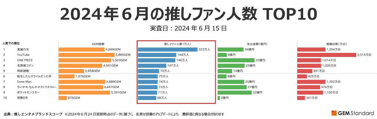 メディアを横断して、推しているファン(=推しファン)が最も多いエンタメブランドはなにか。エンタテイメント業界に向けたデータ×デジタルマーケティングサービスを提供するGEM Partners株式会社(ジェムパートナーズ、所在地:東京都港区、代表取締役:梅津文)では、エンタメビジネスの最大化をサポートする商品「推しエンタメブランドスコープ」で毎月調査を実施しており、最新のエンタメブランド価値を計測することが可能です。今回、2024年6月の最新調査結果のハイライトをお伝えします。