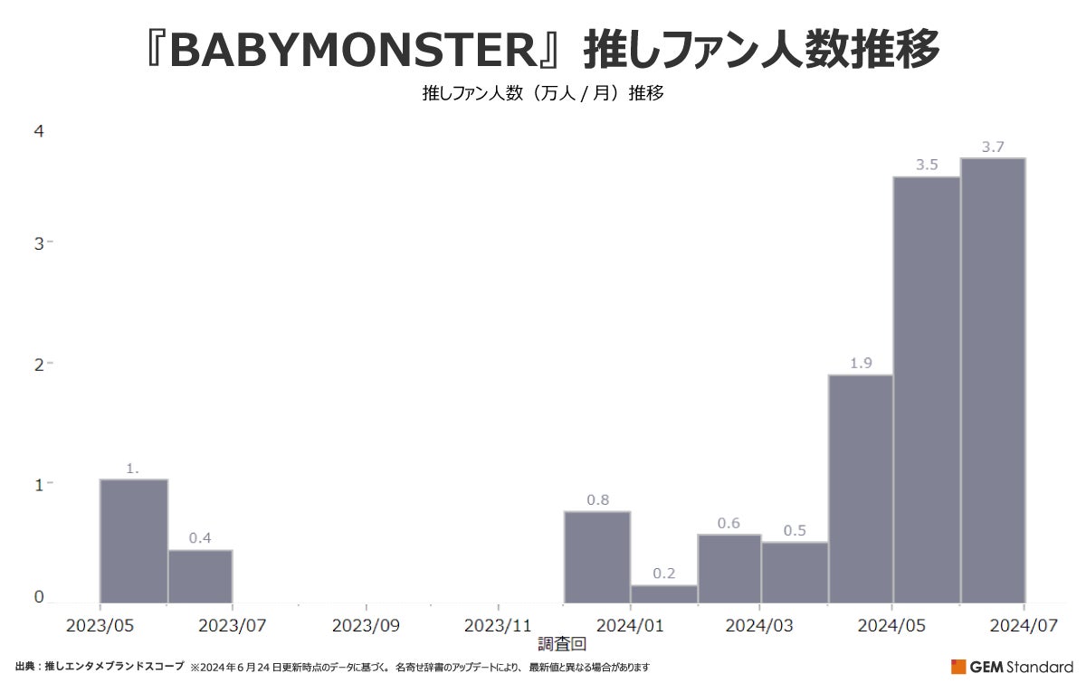 3位に入ったのは韓国のガールズグループ『BABYMONSTER』。同グループもデビュー曲『SHEESH』を含む1stミニアルバム『BABYMONS7ER』を4月2日にリリースし、推しファン人数を急拡大しました。その後、首位の『ILLIT』と同水準で安定的に推移しています。