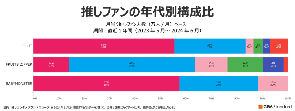 『ILLIT』と『BABYMONSTER』はどちらも、「女性」「10代(15~19歳)」の割合が高く、女性若年層が推しファンの中心であることは共通しています。一方で、『ILLIT』は『BABYMONSTER』よりも「男性」割合が高く、また年代も40代以上に広がっている点が特徴です。また、『FRUITS ZIPPER』は男女ほぼ半々、年代の中心層は「20代」となっており、『ILLIT』『BABYMONSTER』よりも年代高めのファン層となっていることが分かります。