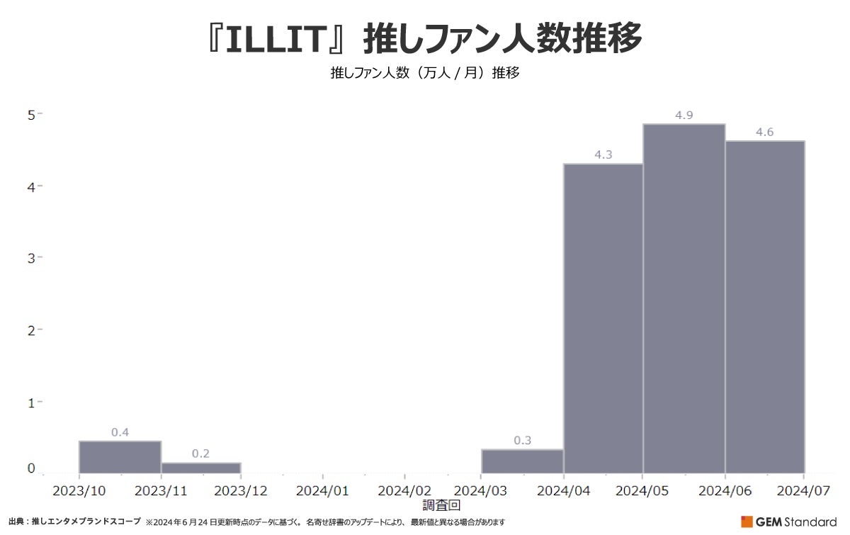 1位を獲得したのは韓国のガールズグループ『ILLIT』。話題となったデビュー曲『Magnetic』を含むミニアルバム『SUPER REAL ME』が3月25日にリリースされ、4月調査時点で推しファン人数を急拡大。その後、安定的に推移しています。
